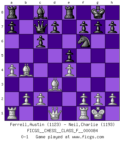 Last move : 0-1 2010 July 28 21:48:9 [Event "FICGS__CHESS__CLASS_F__000084"] [Site "FICGS"] [Date "2010.05.07"] [Round "1"] [White "Ferrell,Austin"] [Black "Neil,Charlie"] [Result "0-1"] [WhiteElo "1123"] [BlackElo "1193"] 1.e4 c5 2.Nf3 Nc6 3.d4 cxd4 4.Nxd4 Nf6 5.Nxc6 bxc6 6.Nc3 Qa5 7.Bd3 e5 8.O-O Bb4 9.Bd2 Bxc3 10.Bxc3 Qc7 11.a4 O-O 12.Bb4 Re8 0-1 Sicilian defense Kingside Castling by player White (move 8) Kingside Castling by player Black (move 11) Player Black won this chess game. Follow this game move after move (download)You can only get good at Chess if you love the game. (Bobby Fischer) Im Schach gewinnt jeder. Hat man Freunde am Spiel - und das ist die Hauptsache - ist auch der Verlust einer Partie kein Unglück. (David Bronstein) Una partida de Ajedrez se divide en 3 etapas: la primera cuando piensas que tienes la ventaja, la segunda cuando crees que tienes la ventaja y la tercera... ¡cuando te das cuenta que vas a perder!. (Savielly Tartakower) Le succès, c'est être capable d'aller d'échec en échec sans perdre son enthousiasme. (Winston Churchill) The difference between perseverance and obstinacy is that one comes from a strong will, and the other from a strong won't. (Henry Ward Beecher)