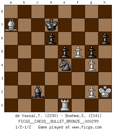 Last move : 1/2-1/2 2010 May 7 21:25:11 [Event "FICGS__CHESS__BULLET_BRONZE__000299"] [Site "FICGS"] [Date "2010.05.07"] [Round "1"] [White "de Vassal,Thibault"] [Black "Boehme,Sebastian"] [Result "1/2-1/2"] [WhiteElo "2230"] [BlackElo "2141"] 1.e4 c5 2.Nc3 d6 3.f4 g6 4.Nf3 Bg7 5.Bb5+ Nd7 6.O-O a6 7.Bc4 b5 8.Bxf7+ Kxf7 9.Ng5+ Ke8 10.Ne6 Bd4+ 11.Kh1 Qa5 12.Nd5 Ndf6 13.Ndc7+ Kd7 14.c3 Ra7 15.cxd4 Rxc7 16.Nxc7 Kxc7 17.d3 c4 18.Qc2 Kb8 19.dxc4 bxc4 20.d5 Bb7 21.Be3 Nh6 22.Qxc4 Nhg4 23.Bd4 Rc8 24.Qd3 Qb5 25.Qf3 Rc2 26.Rad1 Qc4 27.h3 Nxe4 28.b3 Qe2 29.hxg4 Rxa2 30.Qxe2 Rxe2 31.Rfe1 Rxe1+ 32.Rxe1 Bxd5 33.Kh2 Kc7 34.Rc1+ Kd7 35.Ra1 g5 36.f5 e5 37.Be3 Bxb3 38.Rxa6 h6 39.Kh3 Bd1 40.Ra7+ Ke8 41.Ra1 Be2 42.Re1 Bd3 43.Ba7 Kd7 44.Rd1 Be2 45.Re1 Bd3 46.Re3 Nf2+ 47.Kg3 Ne4+ 48.Kh2 Bc2 49.Re1 1/2-1/2 Sicilian : Closed Kingside Castling by player White (move 6) This chess game ended in a draw. Follow this game move after move (download)Chess teaches you to control the initial excitement you feel when you see something that looks good and it trains you to think objectively when you're in trouble. (Stanley Kubrick) Capablanka war das größte Genie der Schachgeschichte! Aber denken sie nicht er habe nichts vom Schach verstanden. Er wusste nur soviel wie er wissen musste um seine Ziele zu erreichen. (Mikhail Moiseyevich Botvinik) Yo he agregado estos principios a la ley: pongan los Caballos en acción antes de que los dos Alfiles sean desarrollados. (Emanuel Lasker) Roi des jeux et jeu des rois, les échecs portent en eux un sentiment d'infini. Ils donnent à celui qui s'est efforcé d'en approfondir les arcanes l'impression de n'être pas à la mesure de l'homme; en fait, ils constituent un résumé de l'univers, un microcosme, et figurent cette grande échelle qui, dans les plans de la lumière descend jusqu'à la matière, qui des abîmes insondables remonte jusqu'en l'infini de Dieu. (Pyrame) Beta. Software undergoes beta testing shortly before it's released. Beta is latin for still doesn't work. (Anonymous)