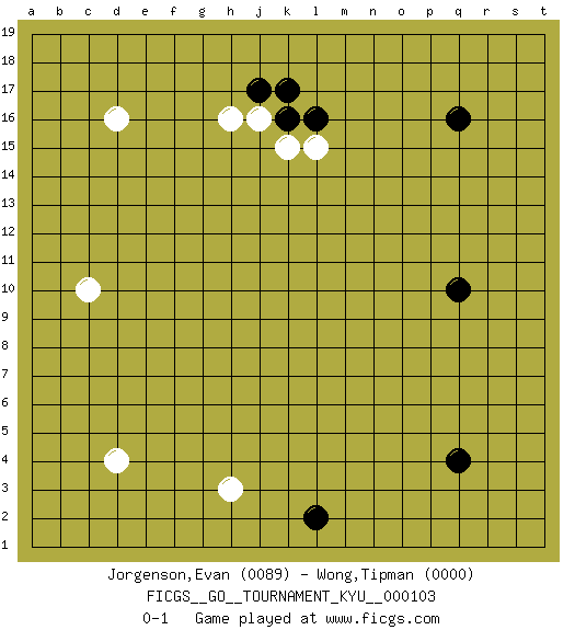 Last move : 0-1 2010 June 19 8:57:28 [Event "FICGS__GO__TOURNAMENT_KYU__000103"] [Site "FICGS"] [Date "2010.05.08"] [Round "1"] [Black "Jorgenson,Evan"] [White "Wong,Tipman"] [Result "0-1"] [Rating 1 "0089"] [Rating 2 "0000"] 1.q4 d16 2.q16 d4 3.q10 c10 4.k17 h3 5.l2 j16 6.l16 k15 7.j17 h16 8.k16 l15 0-1 This go game has been lost on time (started : 2010.05.08 15:33:30) Here are the names of the openings (joseki) played in the four corners : Player White won this Go (weiqi, baduk) game. Follow this game move after move (download)Balance is not what players strike for, and if it does arise, it is in spite of them. (Pierre Audouard) In God we trust, all others we virus scan. (Anonymous)