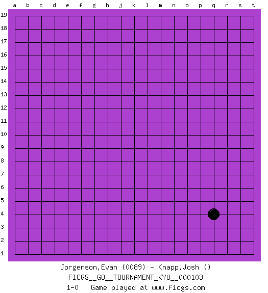 Last move : 1-0 2010 June 19 8:57:28 [Event "FICGS__GO__TOURNAMENT_KYU__000103"] [Site "FICGS"] [Date "2010.05.08"] [Round "1"] [Black "Jorgenson,Evan"] [White "Carlo,John"] [Result "1-0"] [Rating 1 "0089"] 1.q4 1-0 This go game has been lost on time (started : 2010.05.08 15:33:30) Here are the names of the openings (joseki) played in the four corners : Corner q4 : q4 1-0 Hoshi (Hwajeom, Seongjeom, Xingwei`) 4-4 Point. The star or hoshi (4-4) point, emphasizing influence at the potential expense of territory. Player Black won this Go (weiqi, baduk) game. Follow this game move after move (download)Add one stone, then sacrifice both. (Anonymous) Life is like internet, nothing interesting, but noone want to leave it. (Ilmars Cirulis)