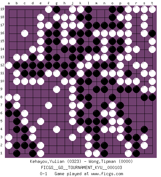Last move : 0-1 2010 September 9 19:37:29 [Event "FICGS__GO__TOURNAMENT_KYU__000103"] [Site "FICGS"] [Date "2010.05.08"] [Round "1"] [Black "Kehayov,Yulian"] [White "Wong,Tipman"] [Result "0-1"] [Rating 1 "0323"] [Rating 2 "0000"] 1.r15 d4 2.q4 c16 3.l17 c10 4.r9 j3 5.l5 j5 6.k8 j8 7.k9 j9 8.k10 j10 9.j12 k11 10.l11 k12 11.j11 l13 12.k13 l12 13.j13 n14 14.l14 m13 15.k6 j6 16.m11 n11 17.n10 o11 18.o13 p13 19.o14 n15 20.p15 q14 21.p14 p12 22.o12 p10 23.n12 q15 24.q16 r14 25.s15 p16 26.p17 o16 27.o10 p11 28.m12 q17 29.r16 p18 30.r17 q18 31.s14 s12 32.p9 q10 33.q9 r10 34.r13 q13 35.s13 r12 36.s10 s11 37.q11 s9 38.s8 t10 39.t8 t9 40.r18 r19 41.s19 q19 42.o17 s18 43.o18 t19 44.n17 l15 45.m14 n13 46.m15 m16 47.k14 n16 48.l16 k7 49.l7 j7 50.k5 k4 51.l4 l3 52.m3 l2 53.m2 m1 54.n1 l1 55.n2 o4 56.p6 p5 57.q5 p4 58.q3 p3 59.m4 o6 60.p7 o7 61.o8 n8 62.m9 m8 63.l10 m7 64.m6 n6 65.n5 n4 66.l8 o5 67.m5 o9 68.n9 q2 69.r2 q1 70.r1 s2 71.r3 s3 72.s4 h17 73.k15 h15 74.g13 g11 75.h12 h10 76.f13 e13 77.f14 e14 78.f15 e15 79.f16 f17 80.g16 h16 81.g17 g18 82.f18 e17 83.g19 h18 84.f12 f11 85.e12 d12 86.e11 e10 87.d11 d10 88.c12 c13 89.d13 d14 90.d12 b13 91.b12 a12 92.g12 b11 93.c11 b10 94.m17 k17 95.k18 j17 96.k16 k19 97.l19 j19 98.l18 j18 99.t12 e16 100.t13 t11 101.h14 e18 102.g15 j15 103.j14 f19 104.j16 s17 105.o19 s16 106.p19 s19 107.t16 t15 108.c3 d3 109.c4 c5 110.b5 c6 111.b6 b7 112.d2 e2 113.d1 e1 114.b2 e5 115.a6 b8 116.a7 a3 117.b4 a2 118.b1 a8 119.c2 t14 120.o15 q16 121.pass f7 122.h11 g9 123.pass pass 124.n7 g4 125.pass pass 0-1 Here are the names of the openings (joseki) played in the four corners : Corner d16 : c16 j12 Komoku (Somok, Xiao~mu`) 3-4 Point. The komoku (3-4) point is the traditional corner enclosure move.. Player White won this Go (weiqi, baduk) game. Follow this game move after move (download)It is difficult to know exactly what you are doing. (Pierre Audouard) Fear is the path to the dark side. Fear leads to anger; anger leads to hate; hate leads to suffering. I sense much fear in you. (Master Yoda in Star Wars ep.1)