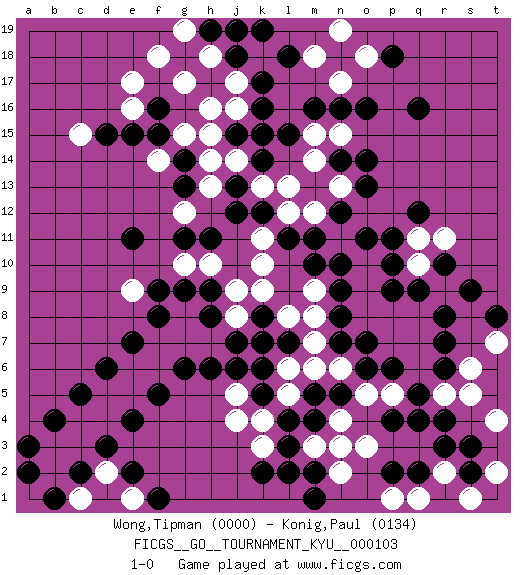Last move : 1-0 2010 September 13 3:25:23 [Event "FICGS__GO__TOURNAMENT_KYU__000103"] [Site "FICGS"] [Date "2010.05.08"] [Round "1"] [Black "Wong,Tipman"] [White "Konig,Paul"] [Result "1-0"] [Rating 1 "0000"] [Rating 2 "0134"] 1.q16 k10 2.k16 k13 3.n16 h15 4.n12 m14 5.n14 k15 6.h17 j16 7.l15 j17 8.k14 j14 9.j15 g17 10.k15 h18 11.j13 h14 12.k12 l13 13.j12 l12 14.m11 n13 15.o13 m12 16.l11 k11 17.h11 h16 18.k17 k18 19.l18 m18 20.k19 j19 21.j18 g19 22.h19 f18 23.j19 n11 24.m10 m9 25.n10 o10 26.o11 o9 27.p11 h13 28.n9 m8 29.n8 o8 30.n7 m7 31.o6 p7 32.p6 q8 33.p9 q10 34.p10 n6 35.n5 m6 36.o7 p8 37.q9 q11 38.q12 r9 39.r8 q7 40.r10 r11 41.s9 q6 42.q5 r5 43.r6 n15 44.o14 n17 45.o16 m15 46.m16 p5 47.q4 s6 48.r7 t4 49.r4 s5 50.s3 t7 51.t8 t2 52.s2 s1 53.q2 n3 54.l3 n4 55.m5 o5 56.l4 l5 57.m4 m3 58.m2 o3 59.p4 n2 60.m1 k4 61.k5 l6 62.l2 k3 63.k2 j4 64.j6 j5 65.k6 k7 66.j7 j8 67.k8 l8 68.l7 k9 69.h8 j9 70.k7 r2 71.r3 q1 72.p2 h7 73.h6 g7 74.g6 g8 75.h9 h10 76.g9 g10 77.f9 e9 78.f8 f7 79.e7 f6 80.f5 e6 81.d6 e5 82.e4 d5 83.c5 d4 84.d3 c4 85.b4 c3 86.c2 b3 87.a3 b2 88.b1 c1 89.a2 p1 90.e11 d2 91.e2 e1 92.f1 o18 93.p18 n19 94.f16 e16 95.f15 f14 96.e15 e17 97.d15 c15 98.g14 g15 99.g13 g12 100.g11 1-0 Here are the names of the openings (joseki) played in the four corners : Corner d16 : h15 h17 This joseki is unknown. A weak or weird move has probably been played in this corner. Corner d4 : j4 j6 This joseki is unknown. A weak or weird move has probably been played in this corner. Player Black won this Go (weiqi, baduk) game. Follow this game move after move (download)The possibility or impossibility of an event results logically from the rules. (Pierre Audouard) Over-the-board chess is the favorite of mortals, correspondence chess is the favorite of the gods. (Eduard Dyckhoff)