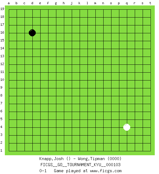 Last move : 0-1 2010 June 15 20:47:22 [Event "FICGS__GO__TOURNAMENT_KYU__000103"] [Site "FICGS"] [Date "2010.05.08"] [Round "1"] [Black "Carlo,John"] [White "Wong,Tipman"] [Result "0-1"] [Rating 2 "0000"] 1.d16 q4 0-1 This go game has been lost on time (started : 2010.05.08 15:33:30) Here are the names of the openings (joseki) played in the four corners : Corner q4 : q4 0-1 Hoshi (Hwajeom, Seongjeom, Xingwei`) 4-4 Point. The star or hoshi (4-4) point, emphasizing influence at the potential expense of territory. Player White won this Go (weiqi, baduk) game. Follow this game move after move (download)Use a wall to attack, not to make territory. (Anonymous) An expert is a man who has made all the mistakes which can be made in a very narrow field. (Niels Bohr)