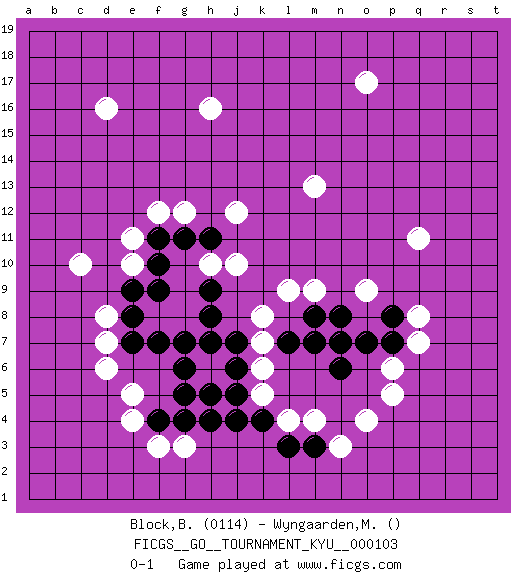 Last move : 0-1 2010 August 24 22:46:38 [Event "FICGS__GO__TOURNAMENT_KYU__000103"] [Site "FICGS"] [Date "2010.05.08"] [Round "1"] [Black "Block,Benjamin"] [White "Wyngaarden,Martin"] [Result "0-1"] [Rating 1 "0114"] 1.p7 d16 2.o7 k7 3.h7 l9 4.h8 c10 5.h9 h10 6.g7 o17 7.n7 o9 8.j7 k6 9.j6 k5 10.j5 e5 11.f7 d6 12.e7 d7 13.e8 d8 14.e9 e10 15.f10 e11 16.f11 o4 17.k4 l4 18.j4 q11 19.m8 f12 20.g11 g12 21.h11 j10 22.l3 m4 23.m3 n3 24.g5 m13 25.g6 j12 26.h5 p5 27.m7 f3 28.g4 p6 29.n8 q7 30.n6 h16 31.f9 g3 32.f4 e4 33.h4 m9 34.p8 q8 35.l7 k8 0-1 This go game has been lost on time (started : 2010.05.08 15:33:30) Here are the names of the openings (joseki) played in the four corners : Player White won this Go (weiqi, baduk) game. Follow this game move after move (download)More haste less speed. (John Fairbairn) When you have everything, sometimes it feels like nothing. (Horatio Caine, C.S.I. Miami)