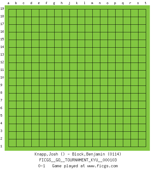 Last move : 0-1 2010 June 14 20:45:51 [Event "FICGS__GO__TOURNAMENT_KYU__000103"] [Site "FICGS"] [Date "2010.05.08"] [Round "1"] [Black "Carlo,John"] [White "Block,Benjamin"] [Result "0-1"] [Rating 2 "0114"] 0-1 This go game has been lost on time (started : 2010.05.08 15:33:30) Here are the names of the openings (joseki) played in the four corners : Player White won this Go (weiqi, baduk) game. Follow this game move after move (download)Don't disturb symmetry. (Anonymous) There are 10 types of people in this world: those who understand binary and those who don't. (Anonymous)