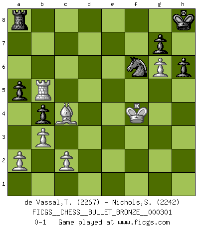 Last move : 0-1 2010 May 8 19:13:39 [Event "FICGS__CHESS__BULLET_BRONZE__000301"] [Site "FICGS"] [Date "2010.05.08"] [Round "1"] [White "de Vassal,Thibault"] [Black "Nichols,Scott"] [Result "0-1"] [WhiteElo "2267"] [BlackElo "2242"] 1.e4 e6 2.d4 d5 3.Nc3 Nf6 4.e5 Nfd7 5.f4 c5 6.Nf3 Nc6 7.Be3 cxd4 8.Nxd4 Bc5 9.Qd2 O-O 10.O-O-O a6 11.h4 Nxd4 12.Bxd4 b5 13.h5 b4 14.Ne2 a5 15.g4 Ba6 16.g5 Qb6 17.g6 h6 18.f5 Bxe2 19.Bxe2 Bxd4 20.Qxd4 Qxd4 21.Rxd4 Nxe5 22.Rg1 exf5 23.Rxd5 Rfe8 24.Bb5 Re7 25.Rg2 f4 26.Re2 f6 27.Red2 Rf8 28.Rd8 Ra7 29.Ba4 Ra8 30.Bb3+ Kh8 31.Rxa8 Rxa8 32.Rd5 f3 33.Kd2 Ng4 34.Rd4 f2 35.Bc4 f5 36.Ke2 Rc8 37.b3 Ra8 38.Kf3 Nf6 39.Rf4 Nxh5 40.Rxf5 Nf6 41.Kxf2 Nd7 42.Rb5 Nf6 43.Ke3 Ne8 44.Rc5 Nf6 45.Kf4 Nd7 46.Rb5 Nf6 0-1 Thibault de Vassal Really sorry to have forgotten the clock here... the endgame was interesting! French : Steinitz, Boleslavsky variation Kingside Castling by player Black (move 9) Queenside Castling by player White (move 10) Player Black won this chess game. Follow this game move after move (download)Chess is played with the mind and not with the hands ! (Renaud and Kahn) Wer mein Gambit spielt, muß bereit sein, alle Brücken hinter sich abzubrechen. Es verändert den ganzen Menschen. Es wirkt wie ein Zauberstab und fördert verkümmerte, gute Charakter- eigenschaften wieder zu Tage. (Emil Joseph Diemer) Nunca antes ha habido un jugador de Ajedrez con tal conocimiento a fondo de las complejidades del juego y una inmensa voluntad absolutamente indomable de ganar. Yo pienso que Fischer es el jugador mas grande que jamás haya existido. (Lisa Lane) Aux échecs, les retours au sommet sont rares : les dommages psychologiques consécutifs à une défaite sont trop sévères. (Daily Telegraph) Memory... is the diary that we all carry with us. (Oscar Wilde, The Importance of Being Earnest)