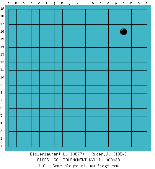 Last move : 1-0 2010 June 8 21:25:49 [Event "FICGS__GO__TOURNAMENT_KYU_I__000028"] [Site "FICGS"] [Date "2010.05.08"] [Round "1"] [Black "Didierlaurent,Ludovic"] [White "Ruder,John"] [Result "1-0"] [Rating 1 "0877"] [Rating 2 "1354"] 1.q16 1-0 This go game has been lost on time (started : 2010.05.08 21:18:6) Here are the names of the openings (joseki) played in the four corners : Player Black won this Go (weiqi, baduk) game. Follow this game move after move (download)A knight's move near the edge of the board cannot be cut. (Bill Taylor) A bird doesn't sing because it has an answer, it sings because it has a song. (Maya Angelou)
