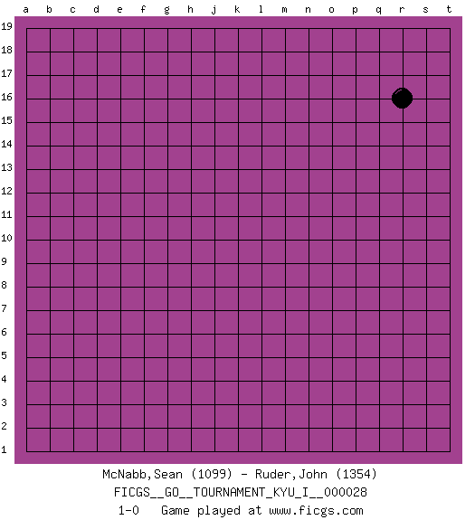 Last move : 1-0 2010 June 7 21:20:52 [Event "FICGS__GO__TOURNAMENT_KYU_I__000028"] [Site "FICGS"] [Date "2010.05.08"] [Round "1"] [Black "McNabb,Sean"] [White "Ruder,John"] [Result "1-0"] [Rating 1 "1099"] [Rating 2 "1354"] 1.r16 1-0 This go game has been lost on time (started : 2010.05.08 21:18:6) Here are the names of the openings (joseki) played in the four corners : Player Black won this Go (weiqi, baduk) game. Follow this game move after move (download)I really believe that Go is destined to take the place of Chess as the leading intellectual game of the Occident, just as it has reigned supreme in the Orient for some four thousand years. (Edward Lasker, international chess master) For to win one hundred victories in one hundred battles is not the acme of skill. To subdue the enemy without fighting is the acme of skill. (Sun Tzu)