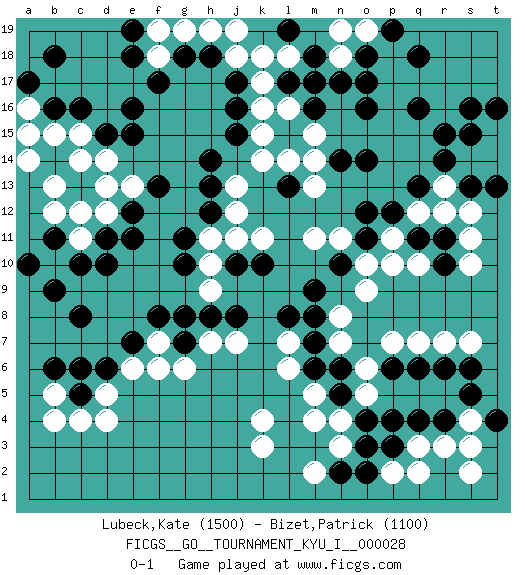 Last move : 0-1 2010 December 25 10:41:47 [Event "FICGS__GO__TOURNAMENT_KYU_I__000028"] [Site "FICGS"] [Date "2010.05.08"] [Round "1"] [Black "Lubeck,Kate"] [White "Bizet,Patrick"] [Result "0-1"] [Rating 1 "1500"] [Rating 2 "1100"] 1.q16 d4 2.c16 r3 3.j17 q10 4.e16 k4 5.d10 d13 6.e12 e13 7.f13 d12 8.e11 c11 9.c10 c15 10.d15 b15 11.b16 d14 12.e15 b10 13.b9 b12 14.c8 e6 15.f8 g6 16.j10 m17 17.o17 m15 18.o14 m13 19.o12 m11 20.n10 k14 21.h14 k16 22.j16 k17 23.j15 k15 24.o16 r13 25.r15 s14 26.s15 q7 27.c5 c4 28.d6 d5 29.c6 k3 30.q4 q3 31.p4 o6 32.p3 n3 33.r4 p2 34.o2 q2 35.o3 s4 36.s5 s2 37.t4 s3 38.q6 r7 39.r6 s7 40.s6 n4 41.n2 m2 42.p6 p7 43.n5 o5 44.o4 m5 45.n6 n7 46.m6 l6 47.m7 l7 48.m8 m4 49.l8 n8 50.m9 j13 51.h13 j12 52.h12 b4 53.e7 f7 54.g8 n18 55.o18 h7 56.g7 f6 57.h8 j7 58.j8 t15 59.t16 t14 60.s16 o19 61.p19 n19 62.q18 k11 63.k10 o9 64.r14 s12 65.q13 q12 66.p12 p11 67.o11 o10 68.r11 r12 69.q11 s11 70.r10 p10 71.t13 s10 72.s13 b5 73.b6 j11 74.n17 h11 75.g11 h10 76.g10 n11 77.m18 l18 78.l19 j18 79.h18 j19 80.m16 l16 81.l13 l14 82.l17 k18 83.n14 m14 84.b14 c14 85.a10 a14 86.b11 b13 87.d11 c12 88.m17 h19 89.g18 g19 90.e18 f19 91.e19 f18 92.f17 a16 93.a17 a15 94.b18 h9 0-1 This go game has been lost on time (started : 2010.05.08 21:18:6) Here are the names of the openings (joseki) played in the four corners : Corner d4 : d4 b9 Hoshi (Hwajeom, Seongjeom, Xingwei`) 4-4 Point. The star or hoshi (4-4) point, emphasizing influence at the potential expense of territory. Corner q16 : q16 m17 Hoshi (Hwajeom, Seongjeom, Xingwei`) 4-4 Point. The star or hoshi (4-4) point, emphasizing influence at the potential expense of territory. Player White won this Go (weiqi, baduk) game. Follow this game move after move (download)Play slow, win slow; play fast, lose fast. (Anonymous) If you have any trouble condescending, find a Unix user to show you how it's done. (Scott Adams)