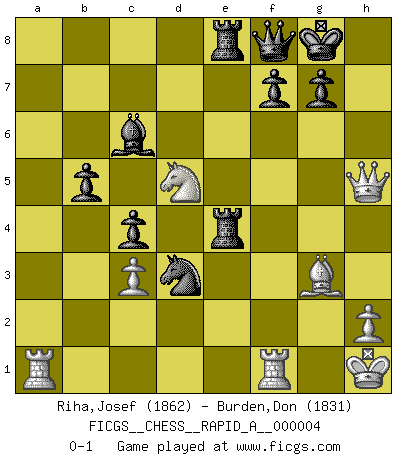 Last move : 0-1 2007 January 1 23:23:43 [Event "FICGS__CHESS__RAPID_A__000004"] [Site "FICGS"] [Date "2006.11.01"] [Round "1"] [White "Riha,Josef"] [Black "Burden,Don"] [Result "0-1"] [WhiteElo "1862"] [BlackElo "1831"] 1.c4 Nf6 2.d4 e6 3.Nc3 Bb4 4.a3 Bxc3+ 5.bxc3 c5 6.f3 d5 7.cxd5 exd5 8.e3 Qc7 9.Ra2 Bf5 10.dxc5 O-O 11.g4 Be6 12.Rb2 Nfd7 13.Ne2 Nxc5 14.Nd4 Nbd7 15.Be2 a6 16.O-O b5 17.Bd2 Ne5 18.Be1 Nc4 19.Bxc4 dxc4 20.Bg3 Qb6 21.Rb1 Nd3 22.a4 Bd7 23.Qd2 Rfd8 24.Kh1 Qc5 25.axb5 axb5 26.Rfd1 Ra6 27.e4 h5 28.Nf5 hxg4 29.Qg5 Qf8 30.Ne7+ Kh8 31.fxg4 Re8 32.Ra1 Rf6 33.Nd5 Rg6 34.Qe3 Rxg4 35.Qf3 Rgxe4 36.Qh5+ Kg8 37.Rf1 Bc6 0-1 English, 1...Nf6 (Anglo-Indian defense) Kingside Castling by player Black (move 10) Kingside Castling by player White (move 16) Player Black won this chess game. Follow this game move after move (download)Avoid the crowd. Do your own thinking independently. Be the Chess player, not the Chess piece. (Ralph Charell) Modernes Schach erfordert enorme Anspannung. Es ist für einen normalen Menschen unmöglich das auszuhalten. (Viktor Kortschnoi) Con el tiempo, empecé a progresar en partidas decisivas. Tal vez porque me di cuenta de una simple verdad: no solo estaba yo nervioso sino también mi oponente. (Mikhail Tal) Aux échecs, les retours au sommet sont rares : les dommages psychologiques consécutifs à une défaite sont trop sévères. (Daily Telegraph) Cactus - It is depressed cucumber. (Ilmars Cirulis)