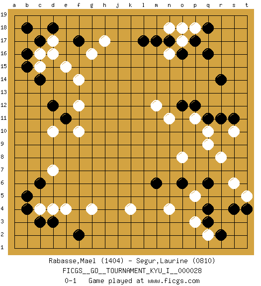 Last move : 0-1 2010 September 8 23:27:13 [Event "FICGS__GO__TOURNAMENT_KYU_I__000028"] [Site "FICGS"] [Date "2010.05.08"] [Round "1"] [Black "Rabasse,Mael"] [White "Segur,Laurine"] [Result "0-1"] [Rating 1 "1404"] [Rating 2 "0810"] 1.q16 d4 2.q4 d16 3.f17 p3 4.q3 n4 5.q6 k4 6.c14 e15 7.c17 f14 8.c6 d10 9.c3 c4 10.d3 e4 11.b4 g4 12.b5 d7 13.f2 c16 14.b16 d17 15.b18 c15 16.b15 h17 17.d18 r8 18.r11 q9 19.r14 s6 20.s4 t5 21.t4 o8 22.l17 n16 23.n17 o17 24.o16 n18 25.m17 o18 26.p17 p18 27.q18 g16 28.d12 f12 29.e11 f10 30.o6 q2 31.r2 s10 32.s11 q10 33.q11 p11 34.p12 n11 35.o12 m12 36.m6 p5 0-1 This go game has been lost on time (started : 2010.05.08 21:18:6) Here are the names of the openings (joseki) played in the four corners : Corner d16 : d16 f17 Hoshi (Hwajeom, Seongjeom, Xingwei`) 4-4 Point. The star or hoshi (4-4) point, emphasizing influence at the potential expense of territory. Ikken Kakari (Hankan Keolch'im, Yi Gua`jiao~, 1-Space Low Approach). Black 2 is the standard approach move to the 4-4. Corner q4 : q4 p3 Hoshi (Hwajeom, Seongjeom, Xingwei`) 4-4 Point. The star or hoshi (4-4) point, emphasizing influence at the potential expense of territory. Corner d4 : d4 c6 Hoshi (Hwajeom, Seongjeom, Xingwei`) 4-4 Point. The star or hoshi (4-4) point, emphasizing influence at the potential expense of territory. Ikken Kakari (Hankan Keolch'im, Yi Gua`jiao~, 1-Space Low Approach). Black 2 is the standard approach move to the 4-4. Player White won this Go (weiqi, baduk) game. Follow this game move after move (download)Each step in a ladder is worth 7 points. (Anonymous) Watch your thoughts; they become words. Watch your words; they become actions. Watch your actions; they become habits. Watch your habits; they become character. Watch your character; it becomes your destiny. (Frank Outlaw)