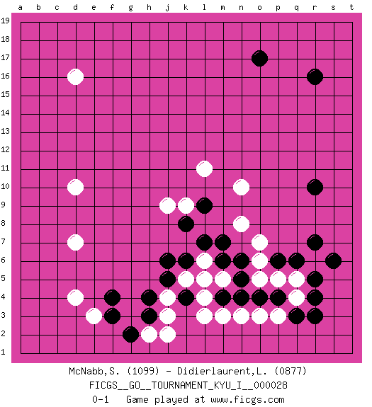 Last move : 0-1 2010 August 3 22:2:27 [Event "FICGS__GO__TOURNAMENT_KYU_I__000028"] [Site "FICGS"] [Date "2010.05.08"] [Round "1"] [Black "McNabb,Sean"] [White "Didierlaurent,Ludovic"] [Result "0-1"] [Rating 1 "1099"] [Rating 2 "0877"] 1.r16 d4 2.q3 d16 3.o17 d10 4.f3 e3 5.f4 d7 6.k4 q4 7.r4 q5 8.r5 p3 9.r3 r6 10.p4 o3 11.q6 p5 12.p6 o5 13.r7 l3 14.n4 n3 15.o4 o6 16.m4 l4 17.m6 o7 18.s6 l5 19.n6 n8 20.l7 m5 21.n5 l6 22.m7 k9 23.l9 n10 24.r10 l11 25.k8 j9 26.k6 k5 27.j5 m3 28.j6 j4 29.h4 j3 30.h3 h2 31.g2 j2 0-1 This go game has been lost on time (started : 2010.05.08 21:18:6) Here are the names of the openings (joseki) played in the four corners : Corner d4 : d4 f3 Hoshi (Hwajeom, Seongjeom, Xingwei`) 4-4 Point. The star or hoshi (4-4) point, emphasizing influence at the potential expense of territory. Ikken Kakari (Hankan Keolch'im, Yi Gua`jiao~, 1-Space Low Approach). Black 2 is the standard approach move to the 4-4. Corner q4 : q3 q4 Komoku (Somok, Xiao~mu`) 3-4 Point. The komoku (3-4) point is the traditional corner enclosure move.. Player White won this Go (weiqi, baduk) game. Follow this game move after move (download)Strange things happen at the one-two points. (Anonymous) I believe in luck. How else can you explain the success of those you dislike ? (Jean Cocteau)