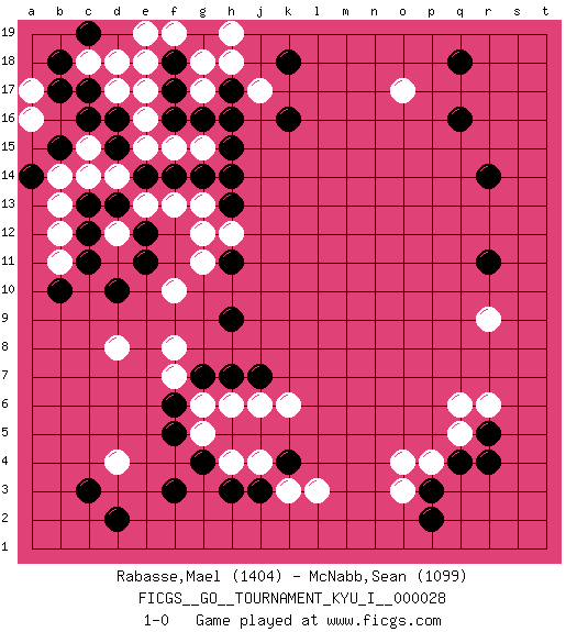 Last move : 1-0 2010 August 10 22:29:39 [Event "FICGS__GO__TOURNAMENT_KYU_I__000028"] [Site "FICGS"] [Date "2010.05.08"] [Round "1"] [Black "Rabasse,Mael"] [White "McNabb,Sean"] [Result "1-0"] [Rating 1 "1404"] [Rating 2 "1099"] 1.q16 d4 2.q4 d17 3.d15 d12 4.g16 j17 5.c17 c18 6.c16 e18 7.d10 d8 8.e11 f13 9.e12 e13 10.d13 d14 11.c13 c14 12.e14 b13 13.c12 b12 14.c11 e15 15.f14 c15 16.d16 e16 17.b18 a16 18.c19 d18 19.b17 a17 20.b15 b14 21.a14 b11 22.b10 f15 23.g14 g18 24.f17 g15 25.h15 e17 26.h17 h18 27.f18 f19 28.f16 g17 29.f3 o17 30.r14 f8 31.d2 l3 32.j3 o3 33.p3 o4 34.c3 q5 35.r5 r6 36.r4 q6 37.r11 p4 38.p2 h4 39.h3 j4 40.g4 r9 41.q18 g5 42.f5 g6 43.f6 f7 44.k4 k3 45.g7 h6 46.h7 j6 47.j7 k6 48.h9 f10 49.h11 g11 50.h13 g12 51.h16 e19 52.g19 h19 53.k16 g13 54.h14 h12 55.k18 1-0 Here are the names of the openings (joseki) played in the four corners : Corner d16 : d17 d15 Komoku (Somok, Xiao~mu`) 3-4 Point. The komoku (3-4) point is the traditional corner enclosure move.. Ikken Takagakari (Hankan Nop'dakeolch'im, Yi Gaogua`jiao~, 1-Space High Approach). The 5-4 approach move has become more popular in modern times, as modern Go emphasizes speed and influence. Corner q16 : q16 o17 Hoshi (Hwajeom, Seongjeom, Xingwei`) 4-4 Point. The star or hoshi (4-4) point, emphasizing influence at the potential expense of territory. Ikken Kakari (Hankan Keolch'im, Yi Gua`jiao~, 1-Space Low Approach). White 2 is the standard approach move to the 4-4. Corner q4 : q4 l3 Hoshi (Hwajeom, Seongjeom, Xingwei`) 4-4 Point. The star or hoshi (4-4) point, emphasizing influence at the potential expense of territory. Player Black won this Go (weiqi, baduk) game. Follow this game move after move (download)Don't overlook the edge of the board. (Anonymous) I take risks, sometimes patients die, but not taking risks causes more patients to die. So I guess my biggest problem is I've been cursed with the ability to do the math. (Gregory House, House M.D.)