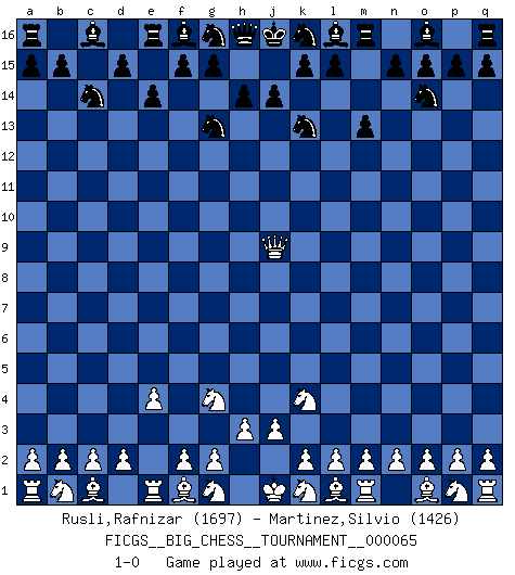Last move : 1-0 2010 July 13 9:27:0 [Event "FICGS__BIG_CHESS__TOURNAMENT__000065"] [Site "FICGS"] [Date "2010.05.09"] [Round "1"] [White "Rusli,Rafnizar"] [Black "Martinez,Silvio"] [Result "1-0"] [WhiteElo "1697"] [BlackElo "1426"] 1.j2-k4 h15-g13 2.h1-o7 m15-m13 3.o7-c7 j15-k13 4.c7-c15 b16-c14 5.c15-j9 e15-e14 6.h2-g4 p16-o14 7.e2-e4 1-0 This big chess game has been lost on time (started : 2010.05.09 15:42:27) Follow this game move after move (download)There's never before been a Chess player with such a thorough knowledge of the intricacies of the game and such an absolutely indomitable will to win. I think Bobby is the greatest player that ever lived. (Lisa Lane) Dass jemand wie Surab Asmaiparaschwili, der selbst Elopunkte gekauft hat , Vize-Präsident der Fide werden konnte, sagt schon einges über den Zustand dieser Organisation aus. (Joel Lautier) Todo se encuentra en un estado de flujo y esto incluye al mundo del Ajedrez. (Mikhail Botvinnik) Je ne crois pas en la psychologie, je crois aux bons coups. (Robert Fischer) He who is a good ruler must first have been ruled. (Aristotle)