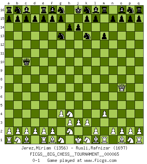 Last move : 0-1 2010 July 12 9:25:19 [Event "FICGS__BIG_CHESS__TOURNAMENT__000065"] [Site "FICGS"] [Date "2010.05.09"] [Round "1"] [White "Jerez,Miriam"] [Black "Rusli,Rafnizar"] [Result "0-1"] [WhiteElo "1356"] [BlackElo "1697"] 1.g2-g4 j15-k13 2.j2-h4 h16-o10 3.m2-m4 o10-c10 4.h1-o7 h15-g13 5.k2-k3 m15-m13 0-1 This big chess game has been lost on time (started : 2010.05.09 15:42:27) Follow this game move after move (download)In Fischer's hands, a slight theoretical advantage is as good a being a Queen ahead. (Isaac Kashdan) Schach ist gnadenlos. Du mußt bereit sein zu töten. (Nigel Short) El Ajedrez es en su esencia, un juego. En su forma, un arte. Y en su ejecución, una ciencia. (Baron Tassilo) Même si l'adversaire joue le coup analysé précédemment, recommencez l'analyse en voyant la nouvelle position. Première règle de Blumenfeld However beautiful the strategy, you should occasionally look at the results. (Winston Churchill)