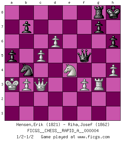 Last move : 1/2-1/2 2006 December 11 17:6:13 [Event "FICGS__CHESS__RAPID_A__000004"] [Site "FICGS"] [Date "2006.11.01"] [Round "1"] [White "Hensen,Erik"] [Black "Riha,Josef"] [Result "1/2-1/2"] [WhiteElo "1821"] [BlackElo "1862"] 1.e4 c5 2.Nf3 Nc6 3.d4 cxd4 4.Nxd4 Nf6 5.Nc3 d6 6.Bg5 e6 7.Qd2 Be7 8.O-O-O Qb6 9.Nb3 O-O 10.f3 Rd8 11.Kb1 d5 12.Bxf6 Bxf6 13.exd5 Nb4 14.d6 a5 15.Ne4 Be5 16.c4 Bd7 17.c5 Qc6 18.Bc4 Nxa2 19.Qg5 f6 20.Qg4 Nb4 21.Nd4 Bxd4 22.Rxd4 Rf8 23.Bxe6+ Bxe6 24.Qxe6+ Kh8 25.h4 Rae8 26.Qb3 Qd7 27.Qa3 Nc6 28.Rd5 Nb4 29.Rd2 Ra8 30.Re1 h6 31.R1e2 Rfd8 32.g4 f5 33.gxf5 Qxf5 34.Rd1 Rac8 35.Qe3 Rd7 36.Rg2 Qe6 37.b3 Qf5 38.Kb2 Re8 39.Qc3 Rf7 40.Rg3 Re5 41.Rdg1 Qf4 42.Rg4 Qf5 43.R1g2 Nd5 44.Qd4 Nb4 45.Rg6 Nc6 46.Qc3 Nb4 47.Ka3 Nc6 48.Qe3 Re6 49.Rxe6 Qxe6 50.Re2 Rf8 51.Qd3 Qe5 52.Qc3 Qf5 53.Nd2 Rg8 54.Kb2 Rd8 55.Re1 Qd5 56.Rg1 Rg8 57.Ne4 Qf5 58.Rg3 Nb4 59.Ka3 1/2-1/2 Sicilian defense Queenside Castling by player White (move 8) Kingside Castling by player Black (move 9) This chess game ended in a draw. Follow this game move after move (download)Fischer is an American Chess tragedy on par with Morphy and Pillsbury. (Mig Greengard) Was ist der Unterschied zwischen einem Strassenarbeiter und einem Schachspieler? --Der Schachspieler bewegt sich ab und zu. (Anonymous) El Ajedrez por encima de todo... ¡es una pelea!. (Emanuel Lasker) RxDa4 pat (...) If we don't succeed, we run the risk of failure. (George W. Bush)