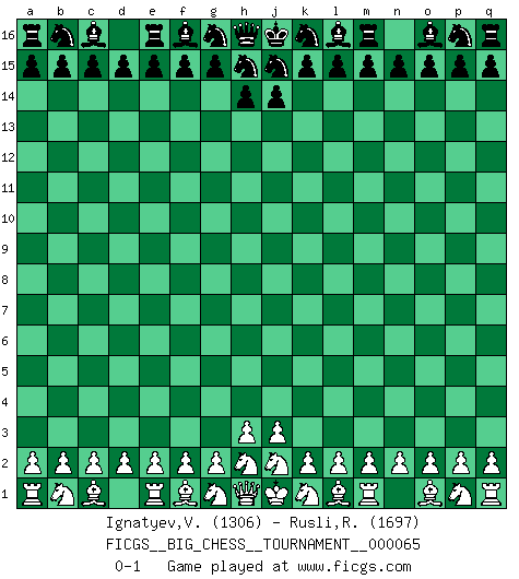 Last move : 0-1 2010 May 10 1:36:57 [Event "FICGS__BIG_CHESS__TOURNAMENT__000065"] [Site "FICGS"] [Date "2010.05.09"] [Round "1"] [White "Ignatyev,Vladimir"] [Black "Rusli,Rafnizar"] [Result "0-1"] [WhiteElo "1306"] [BlackElo "1697"] 0-1 Follow this game move after move (download)All I want to do, ever, is just play Chess. (Bobby Fischer) Ich habe die Schachforschung dermaßen betrieben, dass sie auf eine wissenschaftliche Basis gestellt wurde. (Mikhail Moiseyevich Botvinik) El Ajedrez es un cuento de Hadas de las 1001 metidas de pata. (Savielly Tartakower) J'ai vu le vaincu d'Echecs jouer des années durant dans l'espoir de la fête de la victoire. Car tu es plus riche de ce qu'elle existe si même elle n'est point pour toi. Ainsi de la perle du fond des mers. (Antoine de Saint-Exupéry) If only faces could talk... (Pat Summerall, Sportscaster during the Super Bowl)
