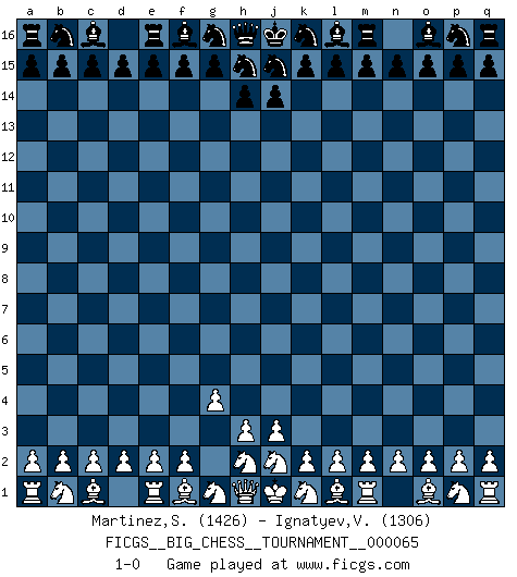 Last move : 1-0 2010 May 10 1:36:44 [Event "FICGS__BIG_CHESS__TOURNAMENT__000065"] [Site "FICGS"] [Date "2010.05.09"] [Round "1"] [White "Martinez,Silvio"] [Black "Ignatyev,Vladimir"] [Result "1-0"] [WhiteElo "1426"] [BlackElo "1306"] 1.g2-g4 1-0 Follow this game move after move (download)Some sacrifices are sound; the rest are mine. (Mikhail Tal) Man gibt nur Pakete auf. (Paul Keres) Aquellos que dicen que entienden al Ajedrez, no entienden nada. (Robert Hubner) Si je n'étais pas joueur d'échecs, je serais le meilleur dans quelque chose d'autre. (Anatoli Karpov) You can think I'm wrong, but that's no reason to quit thinking. (Gregory House, House M.D.)