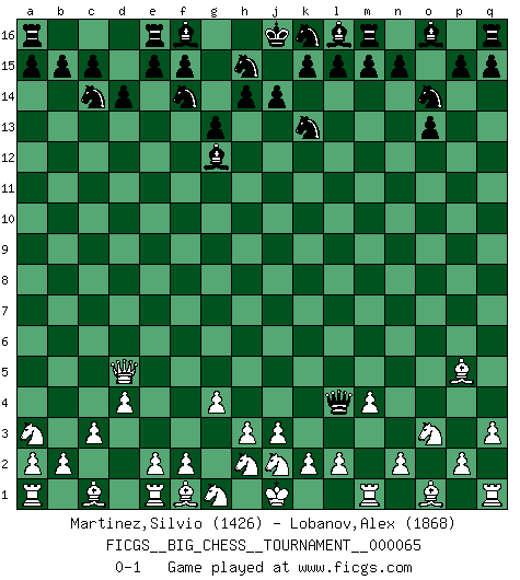 Last move : 0-1 2010 July 12 9:25:19 [Event "FICGS__BIG_CHESS__TOURNAMENT__000065"] [Site "FICGS"] [Date "2010.05.09"] [Round "1"] [White "Martinez,Silvio"] [Black "Lobanov,Alex"] [Result "0-1"] [WhiteElo "1426"] [BlackElo "1868"] 1.g2-g4 j15-k13 2.m2-m4 h16-o10 3.h1-f3 g16-f14 4.c2-c3 b16-c14 5.d2-d4 g15-g13 6.p1-q3 d15-d14 7.q3-p5 o10-o2 8.p5-o3 c16-p4 9.k1-m2 o2-n3 10.m2-l4 n3-n13 11.f3-d5 o15-o13 12.q2-q3 p4-g12 13.b1-a3 p16-o14 14.l1-q6 n13-n6 15.q6-p5 n6-l4 0-1 This big chess game has been lost on time (started : 2010.05.09 15:42:27) Follow this game move after move (download)What is the difference between chess and football? Everybody understands football, but nobody plays it. Everybody plays chess, but nobody understands it. Everything is relative. (Vladimir Kramnik) Der Freibauer hat für mich eine Seele, genau wie der Mensch, Wünsche, die unerkannt in ihm schlummern, und Befürchtungen, von deren Existenz er selbst kaum ahnt. (Aaron Nimzowitsch) Es el objetivo de la escuela moderna no tratar cada posición de acuerdo a una regla general, sino de acuerdo al principio inherente en la posición. (Richard Reti) Une platitude souvent récitée à propos des Echecs est qu'une des choses les plus difficiles à réaliser est de gagner une position gagnante. Cela ne manque pas de sens mais, pour ma part, j'ai toujours trouvé plus difficile de gagner une position perdante. (Tim Krabbe) Fear is the path to the dark side. Fear leads to anger; anger leads to hate; hate leads to suffering. I sense much fear in you. (Master Yoda in Star Wars ep.1)