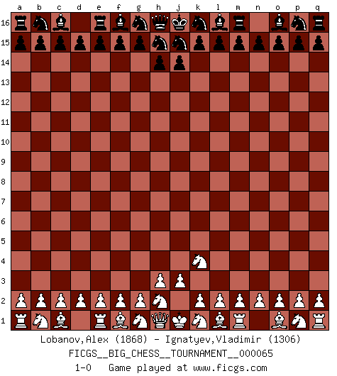 Last move : 1-0 2010 May 10 1:36:50 [Event "FICGS__BIG_CHESS__TOURNAMENT__000065"] [Site "FICGS"] [Date "2010.05.09"] [Round "1"] [White "Lobanov,Alex"] [Black "Ignatyev,Vladimir"] [Result "1-0"] [WhiteElo "1868"] [BlackElo "1306"] 1.j2-k4 1-0 Follow this game move after move (download)Do you realize Fischer almost never has any bad pieces? He exchanges them, and the bad pieces remain with his opponents. (Yuri Balashov) Die Elozahlen sind sehr schlecht für das Schach. Jetzt ist Schach eine Sportindustrie, die darauf zielt Elopunkte zu machen. (Miguel Najdorf) Bendita sea la memoria de aquel que dio al mundo este juego inmortal. (A. G. Gardiner) On n'a jamais que l'âge auquel on a commence à jouer aux échecs car après on cesse de vieillir. (Capablanca) Beep ! (R2D2 in Star Wars ep.3)