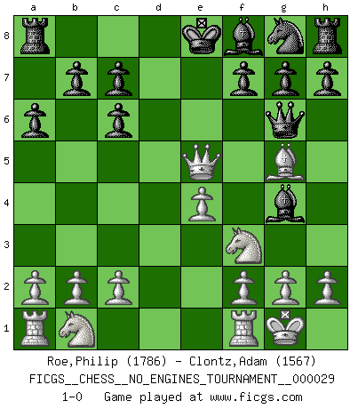 Last move : 1-0 2010 May 18 22:39:26 [Event "FICGS__CHESS__NO_ENGINES_TOURNAMENT__000029"] [Site "FICGS"] [Date "2010.05.10"] [Round "1"] [White "Roe,Philip"] [Black "Clontz,Adam"] [Result "1-0"] [WhiteElo "1786"] [BlackElo "1567"] 1.e4 e5 2.Nf3 Nc6 3.Bb5 a6 4.Bxc6 dxc6 5.O-O Qf6 6.d4 exd4 7.Bg5 Qg6 8.Qxd4 Bg4 9.Qe5+ 1-0 Ruy Lopez : Exchange variation, 5.O-O Kingside Castling by player White (move 5) Player White won this chess game. Follow this game move after move (download)Man is a frivolous, a specious creature, and like a Chess player, cares more for the process of attaining his goal than for the goal itself. (Dostoyevsky) Wenn Dein Gegner dir ein Remis anbietet, versuch herauszufinden, weshalb er glaubt schlechter zu stehen. (Nigel Short) Ser exitoso en el Ajedrez te permite descubrir tu propia personalidad. Eso es lo que deseo para los niños de mi clase. (Saudin Robovic) Le joueur d'Echecs qui veut atteindre le top est obligé de développer son propre credo créatif. Alexeï Stepanovicth Souétine. Il est facile d'écrire des livres ! Ce qui est difficile, c'est de jouer ! (Alexeï Stepanovicth Souétine) May I never be complete. May I never be content. May I never be perfect. Deliver me, Tyler, from being perfect and complete. (Chuck Palahniuk, Fight Club)