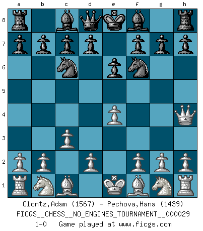 Last move : 1-0 2010 June 24 1:55:50 [Event "FICGS__CHESS__NO_ENGINES_TOURNAMENT__000029"] [Site "FICGS"] [Date "2010.05.10"] [Round "1"] [White "Clontz,Adam"] [Black "Pechova,Hana"] [Result "1-0"] [WhiteElo "1567"] [BlackElo "1439"] 1.e4 e6 2.Qh5 Nc6 3.c3 Nf6 4.Qh4 1-0 French defense Player White won this chess game. Follow this game move after move (download)The isolated Pawn casts gloom over the entire chessboard. (Aaron Nimzovich) Das Schachspiel ist ein See, in welchem eine Mücke baden und ein Elefant ertrinken kann. (Emanuel Lasker) El jugador blanco perdió porque fallo en recordar la coreccta continuación y tuvo que pensar por sí mismo las movidas. (Siegbert Tarrasch) Il n'y a pas eu de défaite parce que je ne crois pas que cet ordinateur ait jamais existé. IBM a triché en refusant d'imprimer les modes de recherche de la machine. C'est évident, pendant le match, des coups décisifs ont été joués par des êtres humains. Aujourd'hui, les meilleurs spécialistes en informatique ne peuvent toujours pas expliquer comment Deep-Blue a pu jouer contre la logique des ordinateurs. IBM a gagné une guerre de communication, mais ils sont incapables de prouver que l'ordinateur a gagné tout seul. (Garry Kasparov) Games, world of games... There's always an opponent, and there's always a victim. (Revolver, movie)