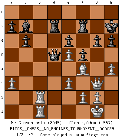 Last move : 1/2-1/2 2010 September 8 17:26:15 [Event "FICGS__CHESS__NO_ENGINES_TOURNAMENT__000029"] [Site "FICGS"] [Date "2010.05.10"] [Round "1"] [White "Me,Gianantonio"] [Black "Clontz,Adam"] [Result "1/2-1/2"] [WhiteElo "2045"] [BlackElo "1567"] 1.d4 d5 2.c4 e6 3.Nc3 Bb4 4.Nf3 h6 5.Bf4 Nf6 6.e3 O-O 7.Bd3 c5 8.O-O Bxc3 9.bxc3 cxd4 10.cxd4 dxc4 11.Bxc4 Nc6 12.Rb1 b6 13.Ne5 Bb7 14.Qe2 Nd5 15.Bxd5 Qxd5 16.Qg4 Nxe5 17.dxe5 Kh7 18.Rb2 Rad8 19.h4 Rd7 20.Rc1 f5 21.Qg3 g6 22.Rbc2 R8f7 23.a3 1/2-1/2 QGD : 3.Nc3 Kingside Castling by player Black (move 6) Kingside Castling by player White (move 8) This chess game ended in a draw. Follow this game move after move (download)In the perfect Chess combination as in a first-rate short story, the whole plot and counter-plot should lead up to a striking finale, the interest not being allayed until the very last moment. (Yates and Winter) Ich hatte meine größten Erfolge, als ich 47 Jahre alt war. Kasparow war noch nicht mal 42 und hat das Schach schon im Stich gelassen. (Viktor Kortschnoi) Cuando no sepas que mover, espera por una idea que se le venga a la la cabeza de tu oponente. Tenlo por seguro de que esa idea estará incorrecta. (Siegbert Tarrasch) Nous vivons dans un monde échiquéen : chaque jour qui passe est un défi à relever. (Philosophe Sasha) To send light into the darkness of men's hearts - such is the duty of the artist. (Schumann)