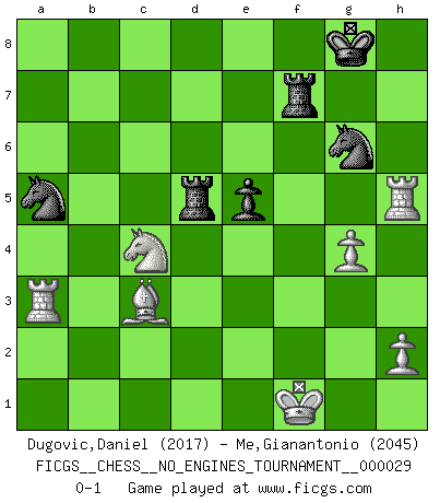 Last move : 0-1 2011 April 30 2:39:12 [Event "FICGS__CHESS__NO_ENGINES_TOURNAMENT__000029"] [Site "FICGS"] [Date "2010.05.10"] [Round "1"] [White "Dugovic,Daniel"] [Black "Me,Gianantonio"] [Result "0-1"] [WhiteElo "2017"] [BlackElo "2045"] 1.c4 e6 2.Nf3 Nf6 3.g3 d5 4.Bg2 dxc4 5.O-O Nbd7 6.Na3 Bxa3 7.bxa3 O-O 8.Qc2 c5 9.Qxc4 b6 10.d3 Bb7 11.a4 Qe7 12.a5 Rfd8 13.Rb1 Bd5 14.Qc2 Rdc8 15.a4 c4 16.Nd2 Bxg2 17.Kxg2 cxd3 18.Qxd3 Nc5 19.Qb5 Nd5 20.Bb2 Qb7 21.e4 a6 22.Qe2 Ne7 23.Ba1 b5 24.axb5 axb5 25.Rxb5 Qa6 26.Rfb1 Qc6 27.Rc1 Qd6 28.Nc4 Qd3 29.Qxd3 Nxd3 30.Rc3 Rd8 31.Nb6 Ra7 32.f4 f5 33.exf5 Nxf5 34.Kf1 h5 35.Ra3 h4 36.g4 Ne7 37.Rg5 g6 38.f5 e5 39.fxg6 Nc6 40.Nc4 Rd5 41.Rh5 Nf4 42.Rxh4 Nxg6 43.Rh5 Nxa5 44.Bc3 Rf7+ 0-1 English Opening Kingside Castling by player White (move 5) Kingside Castling by player Black (move 7) Player Black won this chess game. Follow this game move after move (download)It began to feel as though you were playing against Chess itself. - On playing against Robert Fischer. (Walter Shipman) Ein typischer, sehr verbreiteter Gedankenschädling ist der, daß der betreffende Amateur von der Annanhme ausgeht, daß jeder einzelne Zug etwas zu leisten habe. (Aaron Nimzowitsch) El hombre es un frívolo, una creatura engañosa y como un jugador de Ajedrez, se preocupa mas por el proceso de obtener su meta que de la meta por sí misma. (Dostoyevsky) La solitude du joueur d'Echecs à l'approche du mat est semblable à celle du condamné. (Francis Szpiner) All men can see these tactics whereby I conquer, but what none can see is the strategy out of which victory is evolved. (Sun Tzu)