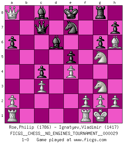 Last move : 1-0 2010 June 14 3:8:6 [Event "FICGS__CHESS__NO_ENGINES_TOURNAMENT__000029"] [Site "FICGS"] [Date "2010.05.10"] [Round "1"] [White "Roe,Philip"] [Black "Ignatyev,Vladimir"] [Result "1-0"] [WhiteElo "1786"] [BlackElo "1417"] 1.Nc3 d5 2.e4 d4 3.Nce2 e5 4.Ng3 c5 5.Nf3 f6 6.Bc4 g6 7.d3 Bd6 8.c3 dxc3 9.bxc3 Nc6 10.O-O a6 11.Be3 Nge7 12.Bh6 b5 13.Bb3 Na5 14.Bg7 Nxb3 15.Qxb3 Rg8 16.Bxf6 Rf8 17.Bg5 Qc7 18.Bh6 c4 19.dxc4 bxc4 20.Qd1 Rg8 21.Ng5 Nc6 22.Qd5 Ne7 23.Qxa8 1-0 Dunst (Sleipner, Heinrichsen) Opening Kingside Castling by player White (move 10) Player White won this chess game. Follow this game move after move (download)The most important feature of the Chess position is the activity of the pieces. This is absolutely fundamental in all phases of the game: Opening, Middlegame and especially Endgame. The primary constraint on a piece's activity is the Pawn structure. (Michael Stean) Ohne Leiden bildet sich kein Charakter. (Ernst Freiherr von Feuchtersleben) Bendita sea la memoria de aquel que dio al mundo este juego inmortal. (A. G. Gardiner) Le temps de noter son nom sur la feuille de partie, j'étais déjà en zeitnot ! D'un modeste amateur apparié lors de la première ronde d'un open contre le grand-maître Azmaïparashvili. If you have any trouble condescending, find a Unix user to show you how it's done. (Scott Adams)
