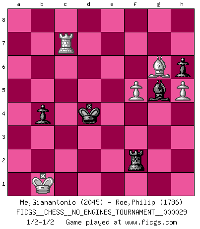 Last move : 1/2-1/2 2011 August 24 15:53:11 [Event "FICGS__CHESS__NO_ENGINES_TOURNAMENT__000029"] [Site "FICGS"] [Date "2010.05.10"] [Round "1"] [White "Me,Gianantonio"] [Black "Roe,Philip"] [Result "1/2-1/2"] [WhiteElo "2045"] [BlackElo "1786"] 1.d4 Nf6 2.c4 Nc6 3.Nf3 e6 4.Nc3 Bb4 5.Qc2 O-O 6.Bg5 h6 7.Bh4 g5 8.Bg3 g4 9.O-O-O gxf3 10.gxf3 Be7 11.Rg1 Kh8 12.Qd2 Ng8 13.e4 d6 14.Bf4 Kh7 15.Be2 e5 16.dxe5 dxe5 17.Qe1 Qe8 18.Be3 Be6 19.Qf1 Bf6 20.Nd5 Qc8 21.Rxg8 Bxd5 22.Rxf8 Qxf8 23.cxd5 Nd4 24.Bxd4 exd4 25.f4 Bg7 26.Kb1 c6 27.e5 cxd5 28.Bd3+ Kh8 29.Qh3 Rc8 30.Qf5 Qg8 31.Bc2 Rc6 32.Rxd4 f6 33.e6 Rxe6 34.a3 Rd6 35.Rd1 Bf8 36.h4 d4 37.Bd3 a6 38.h5 b5 39.Ka1 Qf7 40.Re1 Rc6 41.Bb1 Rc7 42.Re6 Rc5 43.Qe4 Rc1 44.Re8 f5 45.Qxd4+ Kh7 46.Rd8 Bg7 47.Qd5 Qxd5 48.Rxd5 Rf1 49.Rxf5 Kg8 50.Rc5 Rxf2 51.Rc8+ Kf7 52.Rc7+ Kf8 53.Rc8+ Kf7 54.Bg6+ Ke6 55.f5+ Kd7 56.Ra8 Bxb2+ 57.Kb1 Bxa3 58.Rxa6 Be7 59.Rb6 b4 60.Rb7+ Kd8 61.Rb8+ Kd7 62.Rh8 Bg5 63.Rh7+ Kd6 64.Rb7 Kc5 65.Rc7+ Kd4 1/2-1/2 Kevitz-Trajkovich defense Kingside Castling by player Black (move 5) Queenside Castling by player White (move 9) 10 pieces endgame at move 58 : White KRBPP , Black KRBPP WHITE : King + 1 Rook 1 Bishop 2 Pawns BLACK : King + 1 Rook 1 Bishop 2 Pawns This chess game ended in a draw. Follow this game move after move (download)A good player is always lucky. (Jose Raul Capablanca) Ein Schachgenie ist jemand der verdammt gut Schach spielt. (Jonathan Levitt) Siempre es mejor sacrificar los hombres de tu oponente. (Savielly Tartakower) Les échecs sont un jeu par leur forme, un art par leur essence et une science par sa difficulté d'acquisition. Ils peuvent vous procurer autant de plaisir qu'un bon livre ou une belle musique, mais vous n'aurez une réelle joie que si vous arrivez à bien jouer. (Tigran Petrosian) The problem with manipulation is that people can turn on you. (Horatio Caine, C.S.I. Miami)