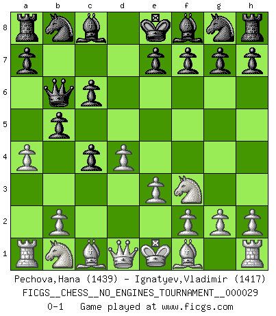 Last move : 0-1 2010 June 24 1:55:32 [Event "FICGS__CHESS__NO_ENGINES_TOURNAMENT__000029"] [Site "FICGS"] [Date "2010.05.10"] [Round "1"] [White "Pechova,Hana"] [Black "Ignatyev,Vladimir"] [Result "0-1"] [WhiteElo "1439"] [BlackElo "1417"] 1.d4 d5 2.c4 dxc4 3.Nf3 c6 4.e3 b5 5.a4 Qb6 0-1 QGA : 3.Nf3 Player Black won this chess game. Follow this game move after move (download)The boy (then a 12 year old boy named Anatoly Karpov) doesn't have a clue about Chess, and there's no future at all for him in this profession. (Mikhail Botvinnik) Ihnen, Herr Lasker, habe ich nur drei Worte zu sagen: Schach und matt. (Siegbert Tarrasch) El Ajedrez es tan inspirador que yo no creo que un buen jugador sea capaz de tener un pensamiento malo durante una partida. (Wilhelm Steinitz) Votre prénom est 'Tactique', votre deuxième prénom est 'Tactique' et votre nom est 'Tactique'. (Ken Smith) May the force be with you. (Han Solo in Star Wars ep.4)