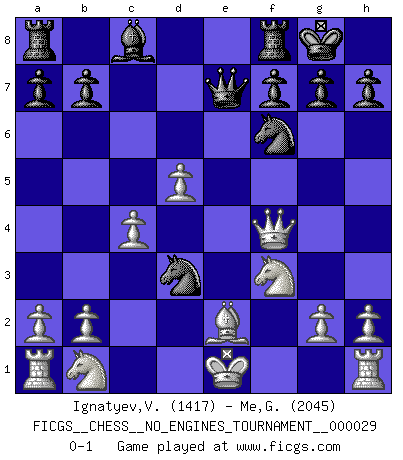 Last move : 0-1 2010 June 20 1:39:35 [Event "FICGS__CHESS__NO_ENGINES_TOURNAMENT__000029"] [Site "FICGS"] [Date "2010.05.10"] [Round "1"] [White "Ignatyev,Vladimir"] [Black "Me,Gianantonio"] [Result "0-1"] [WhiteElo "1417"] [BlackElo "2045"] 1.e4 e5 2.f4 d5 3.exd5 exf4 4.Nf3 Nf6 5.c4 c6 6.dxc6 Nxc6 7.d4 Bb4+ 8.Bd2 O-O 9.d5 Qe7+ 10.Be2 Bxd2+ 11.Qxd2 Ne5 12.Qxf4 Nd3+ 0-1 KGD : Falkbeer counter-gambit Kingside Castling by player Black (move 8) Player Black won this chess game. Follow this game move after move (download)When you absolutely don't know what to do anymore, it is time to panic. (John van der Wiel) Der Vorposten provoziert a) eine Basis für neue Angriffe und b) eine Schwächung der gegnerischen Widerstandskraft in der fraglichen Linie. (Aaron Nimzowitsch) Los Peones son el alma de una partida de Ajedrez. (Francois Andre Danican Philidor) Il (Jacob Murray) ne joue pas pour le bon coup, mais pour le meilleur. (Eloi Relange) Never risk one's whole fortune unless supported by one's entire army. (Niccolo Machiavelli)