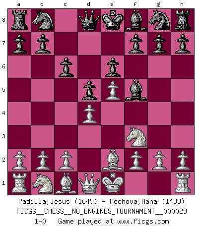 Last move : 1-0 2010 June 22 9:5:44 [Event "FICGS__CHESS__NO_ENGINES_TOURNAMENT__000029"] [Site "FICGS"] [Date "2010.05.10"] [Round "1"] [White "Padilla,Jesus"] [Black "Pechova,Hana"] [Result "1-0"] [WhiteElo "1649"] [BlackElo "1439"] 1.e4 c6 2.d4 d5 3.e5 Bf5 4.Nf3 e6 5.Be2 1-0 This chess game has been lost on time (started : 2010.05.10 11:29:56) Caro-Kann : Advance variation Player White won this chess game. Follow this game move after move (download)Could we look into the head of a Chess player, we should see there a whole world of feelings, images, ideas, emotion and passion. (Alfred Binet) Es hat in meinem Leben Zeiten gegeben, in denen das Schachspiel, wenn nicht zum Lebenszweck, so doch zu einem regelrechten Lebensersatz geworden ist. Man fühlt sich in solchen Zeiten nicht so, als besäße man eine göttliche Gabe, sondern eher so, als sei man von ihr besessen. (Garry Kasparov) EL Ajedrez es como la vida. (Boris Spassky) Un millionnaire : 'Monsieur Steinitz ! Vous ne participez aux tournois que pour l'argent, alors que moi je n'y viens que pour l'honneur.' Steinitz : 'Chacun joue pour ce qu'il n'a pas'... There are two kinds of people in the world, my friend. Those who have a loaded gun and those who dig. You dig ! (Blondie in The Good, The Bad and The Ugly)