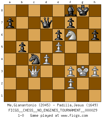 Last move : 1-0 2010 December 3 15:29:42 [Event "FICGS__CHESS__NO_ENGINES_TOURNAMENT__000029"] [Site "FICGS"] [Date "2010.05.10"] [Round "1"] [White "Me,Gianantonio"] [Black "Padilla,Jesus"] [Result "1-0"] [WhiteElo "2045"] [BlackElo "1649"] 1.d4 Nf6 2.c4 e6 3.Nc3 d5 4.Nf3 c5 5.cxd5 Nxd5 6.e4 Nxc3 7.bxc3 cxd4 8.cxd4 Nc6 9.Bc4 Bd6 10.O-O O-O 11.Be3 Bd7 12.Rb1 Rc8 13.Be2 b6 14.e5 Be7 15.Qd2 Na5 16.Rfc1 Rxc1+ 17.Rxc1 Bc6 18.h3 Bd5 19.Qb2 Qa8 20.a3 Rc8 21.Rxc8+ Qxc8 22.Nd2 h6 23.Kh2 Qc6 24.Bf3 Bxf3 25.gxf3 Bf8 26.Kg3 Qa4 27.Qc3 Qxa3 28.Qc7 Qe7 29.Qc2 b5 30.Ne4 Qd7 31.Qc3 Nc4 32.Bxh6 gxh6 33.Nf6+ 1-0 Queen's pawn game Kingside Castling by player White (move 10) Kingside Castling by player Black (move 10) Player White won this chess game. Follow this game move after move (download)Chess is 99 percent tactics. (Teichmann) Ein Gewinn durch eine ungenaue Kombination, sei sie auch noch so vorzeigbar, erfüllt mich mit Schaudern. (Wilhelm Steinitz) Observen a Garry Kasparov. Después de una derrota, invariablemente el gana la próxima partida. Prácticamente hace pedazos a su siguiente oponente. Eso es algo que tenemos que aprender a lograr. (Maurice Ashley) La vérité est comme le meilleur coup aux échecs : elle existe, mais il faut la chercher. (Arturo Perez-Reverte) The good fighters of old first put themselves beyond the possibility of defeat, and then waited for an opportunity of defeating the enemy. (Sun Tzu)