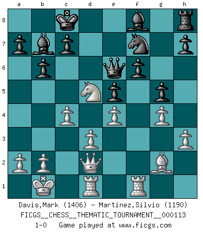 Last move : 1-0 2010 August 7 22:13:57 [Event "FICGS__CHESS__THEMATIC_TOURNAMENT__000113"] [Site "FICGS"] [Date "2010.05.10"] [Round "1"] [White "Davis,Mark"] [Black "Martinez,Silvio"] [Result "1-0"] [WhiteElo "1406"] [BlackElo "1190"] 1.e4 e5 2.f4 exf4 3.Nc3 Nc6 4.Nf3 Nh6 5.d3 b6 6.Bxf4 Bb7 7.h3 d6 8.Qd2 Qf6 9.O-O-O O-O-O 10.Bg5 Qe6 11.Bxd8 Nxd8 12.Kb1 Nc6 13.Nd5 Ne5 14.Nxe5 dxe5 15.c4 f6 16.g4 g5 17.Bg2 Nf7 18.Rhf1 1-0 This chess game has been lost on time (started : 2010.05.10 14:42:10) KGA : Keres (Mason-Steinitz) gambit Queenside Castling by player White (move 9) Queenside Castling by player Black (move 9) Player White won this chess game. Follow this game move after move (download)Not only will I predict his triumph over Botvinnik, but I'll go further and say that he'll probably be the greatest Chess player that ever lived. (John Collins) Wer der Ansicht ist, daß alle Schachspieler verrückt sind, wird durch Studium des Lebens von Emil Josef Diemer nicht auf andere Gedanken kommen. (Hans Ree) El Ajedrez es parte de una cultura y si una cultura esta en decadencia, entonces también el Ajedrez declinará. (Mikhail Botvinnik) Echiquier : carré parfait, comme la Jérusalem nouvelle décrite par l'auteur de l'Apocalypse, huit cases sur huit, exaltation du chiffre 4, symbole du cosmos aux quatre horizons... où le noir et le blanc, l'ombre et la lumière, le mal et le bien s'entremêlent et se conjuguent. (Robert Couffignal, Le Gambit du poète) Somehow our devils are never quite what we expect when we meet them face to face. (Nelson DeMille)