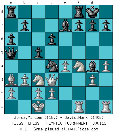 Last move : 0-1 2010 August 7 22:13:57 [Event "FICGS__CHESS__THEMATIC_TOURNAMENT__000113"] [Site "FICGS"] [Date "2010.05.10"] [Round "1"] [White "Jerez,Miriam"] [Black "Davis,Mark"] [Result "0-1"] [WhiteElo "1187"] [BlackElo "1406"] 1.e4 e5 2.f4 exf4 3.Nc3 Nc6 4.Qf3 Nd4 5.Qd3 c5 6.Nh3 Nf6 7.Nxf4 Be7 8.b3 O-O 9.Ba3 d6 10.O-O-O a6 11.g3 Ng4 12.Nh3 Nf6 13.Nf4 Bg4 14.Be2 Bd7 15.h4 Ng4 16.Bxg4 Bxg4 17.Rdf1 Qa5 0-1 This chess game has been lost on time (started : 2010.05.10 14:42:10) KGA : Keres (Mason-Steinitz) gambit Kingside Castling by player Black (move 8) Queenside Castling by player White (move 10) Player Black won this chess game. Follow this game move after move (download)Help your pieces so they can help you. (Paul Morphy) Das Schach hält seine Meister in eigenen Banden, Fesseln; auf vielerlei Weise formt es ihren Geist, so dass die innere Freiheit selbst des Stärksten beeinflusst wird. (Albert Einstein) En partidas rápidas, el Caballo es mas poderoso que el Alfil. (Vlastimil Hort) Les écrivains ont utilisé les échecs pour analyser les côtés extrêmes de la nature humaine. Dans ce cadre, les échecs offrent un champ d'expérimentation idéal. Mais on pourrait faire la même chose avec la peinture. Et là, en vous référant à Van Gogh, vous ne tirerez pas de conclusion définitive sur les peintres. (Gary Kasparov) If you are good, you will be assigned all the work. If you are really good, you will get out of it. (Dan Rotaru)