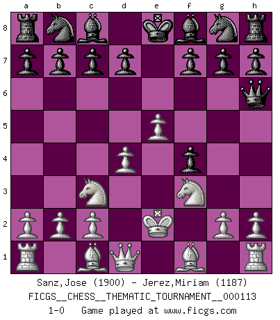 Last move : 1-0 2010 July 16 21:28:44 [Event "FICGS__CHESS__THEMATIC_TOURNAMENT__000113"] [Site "FICGS"] [Date "2010.05.10"] [Round "1"] [White "Sanz,Jose"] [Black "Jerez,Miriam"] [Result "1-0"] [WhiteElo "1900"] [BlackElo "1187"] 1.e4 e5 2.f4 exf4 3.Nc3 Qh4+ 4.Ke2 Nf6 5.Nf3 Qh6 6.e5 Ng8 7.d4 1-0 This chess game has been lost on time (started : 2010.05.10 14:42:10) KGA : Keres (Mason-Steinitz) gambit Player White won this chess game. Follow this game move after move (download)I played Chess with him and would have beaten him sometimes only he always took back his last move, and ran the game out differently. (Mark Twain) Gewöhnliche Menschen denken nur daran, wie sie ihre Zeit verbringen. Ein intelligenter Mensch versucht, sie auszunutzen. (Arthur Schopenhauer) Siempre es mejor sacrificar los hombres de tu oponente. (Savielly Tartakower) Celui qui prend des risques peut perdre, celui qui n'en prend pas perd toujours. (Xavier Tartacover) Programmer - an organism that turns coffee into software. (Anonymous)