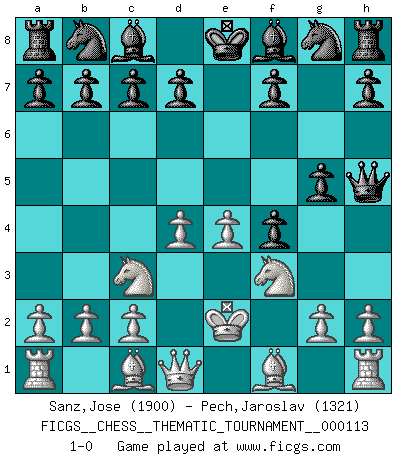 Last move : 1-0 2010 July 6 9:21:13 [Event "FICGS__CHESS__THEMATIC_TOURNAMENT__000113"] [Site "FICGS"] [Date "2010.05.10"] [Round "1"] [White "Sanz,Jose"] [Black "Pech,Jaroslav"] [Result "1-0"] [WhiteElo "1900"] [BlackElo "1321"] 1.e4 e5 2.f4 exf4 3.Nc3 Qh4+ 4.Ke2 g5 5.Nf3 Qh5 6.d4 1-0 This chess game has been lost on time (started : 2010.05.10 14:42:10) KGA : Keres (Mason-Steinitz) gambit Player White won this chess game. Follow this game move after move (download)A sacrifice is best refuted by accepting it. (Wilhelm Steinitz) Es ist schade, dass viele Schachsportler vergessen, wie wichtig Auftreten und angemessene Kleidung sind. (Alexandra Kosteniuk) Tu eres para mi la Reina en d8 y yo soy el Peón en d7!!. (GM Eduard Gufeld) Le temps de noter son nom sur la feuille de partie, j'étais déjà en zeitnot ! D'un modeste amateur apparié lors de la première ronde d'un open contre le grand-maître Azmaïparashvili. Computers make it easier to do a lot of things, but most of the things they make it easier to do don't need to be done. (Andy Rooney)