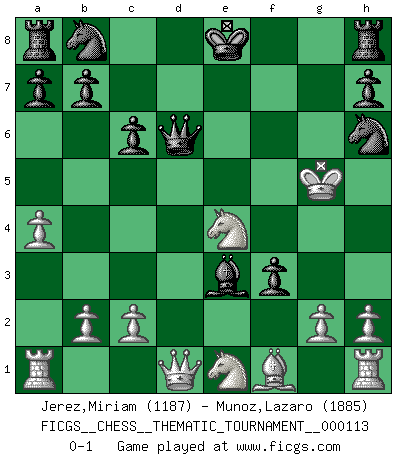 Last move : 0-1 2010 August 5 22:12:20 [Event "FICGS__CHESS__THEMATIC_TOURNAMENT__000113"] [Site "FICGS"] [Date "2010.05.10"] [Round "1"] [White "Jerez,Miriam"] [Black "Munoz,Lazaro"] [Result "0-1"] [WhiteElo "1187"] [BlackElo "1885"] 1.e4 e5 2.f4 exf4 3.Nc3 Qh4+ 4.Ke2 c6 5.Nf3 Qe7 6.d3 g5 7.a4 d5 8.Kf2 Bg7 9.d4 dxe4 10.Ne1 Qd6 11.Nxe4 Bxd4+ 12.Be3 Bxe3+ 13.Kf3 Bg4+ 14.Kxg4 f5+ 15.Kxf5 Nh6+ 16.Kxg5 f3 0-1 This chess game has been lost on time (started : 2010.05.10 14:42:10) KGA : Keres (Mason-Steinitz) gambit Player Black won this chess game. Follow this game move after move (download)The Chess pieces are the block alphabet which shapes thoughts; and these thoughts, although making a visual design on the chessboard, express their beauty abstractly, like a poem. (Marcel Duchamp) Ja, ich habe einmal eine Blitzpartie gespielt, es war in einem Zug, 1929. --im Interview 1989 (Mikhail Moiseyevich Botvinik) La estratégia requiere pensar, la táctica requiere observación. (Max Euwe) Les échecs, c'est l'art d'analyser. (Mikhail Botvinnik) As a goal marker shodan is important. As a destination it is a poor place to stop. (Thomas Tamayo)