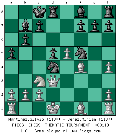 Last move : 1-0 2010 August 12 3:10:56 [Event "FICGS__CHESS__THEMATIC_TOURNAMENT__000113"] [Site "FICGS"] [Date "2010.05.10"] [Round "1"] [White "Martinez,Silvio"] [Black "Jerez,Miriam"] [Result "1-0"] [WhiteElo "1190"] [BlackElo "1187"] 1.e4 e5 2.f4 exf4 3.Nc3 Qh4+ 4.Ke2 b6 5.Nf3 Qf6 6.d4 Bb7 7.e5 Qf5 8.Nh4 Qg4+ 9.Kd2 Qxh4 10.Qe2 Ne7 11.Kd1 Nf5 12.Bd2 Nc6 13.Be1 Qe7 14.Bd2 O-O-O 15.Bxf4 Ncxd4 16.Qc4 d5 17.Qd3 Qh4 18.g3 a5 19.gxh4 1-0 KGA : Keres (Mason-Steinitz) gambit Queenside Castling by player Black (move 14) Player White won this chess game. Follow this game move after move (download)In Chess, just as in life, today's bliss may be tomorrow's poison. (Assaic) Verschiedene, sehr schätzbare und im Laufe des Lebens nützliche Eigenschaften des Geistes können durch das Schachspiel erworben und gekräftigt werden, so dass sie zu Gewohnheiten werden, die uns nie im Stich lassen. (Benjamin Franklin) En posiciones complicadas, Bobby Fischer pocas veces tuvo que temer de cualquiera. (Paul Keres) On n'a jamais que l'âge auquel on a commence à jouer aux échecs car après on cesse de vieillir. (Capablanca) Perseverance does not equal worthiness. Next time you want to get my attention, wear something fun. Low-riding jeans are hot. (Gregory House, House M.D.)