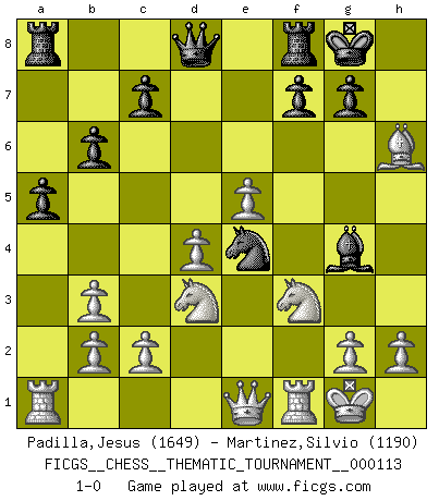 Last move : 1-0 2010 August 8 22:15:36 [Event "FICGS__CHESS__THEMATIC_TOURNAMENT__000113"] [Site "FICGS"] [Date "2010.05.10"] [Round "1"] [White "Padilla,Jesus"] [Black "Martinez,Silvio"] [Result "1-0"] [WhiteElo "1649"] [BlackElo "1190"] 1.e4 e5 2.f4 exf4 3.Nc3 Nc6 4.Bc4 Nf6 5.Nf3 Bc5 6.d4 Bb4 7.O-O O-O 8.e5 d5 9.Bb3 Ne4 10.Nxd5 Na5 11.Nxb4 Nxb3 12.axb3 h6 13.Bxf4 Bf5 14.Be3 a5 15.Nd3 Bg4 16.Qe1 b6 17.Bxh6 1-0 This chess game has been lost on time (started : 2010.05.10 14:42:10) KGA : Keres (Mason-Steinitz) gambit Kingside Castling by player White (move 7) Kingside Castling by player Black (move 7) Player White won this chess game. Follow this game move after move (download)He who takes the Queen's Knight's Pawn will sleep in the streets. (Anonymous) Besser ein falscher Plan, logisch durchgeführt, als gar kein Plan. (Viktor Kortschnoi) Es muy difícil jugar en contra de la teoría de Einstein. - en su primera derrota en contra de Fischer (Mikhail Tal) Mais l'homme est une créature légère et illogique : semblable au joueur d'échecs, il n'aime que le processus du but à atteindre, non le but lui-même. (Dostoïevsky) Any activity becomes creative when the doer cares about doing it right or doing it better. (John Updike)