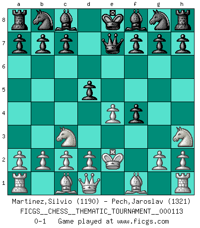 Last move : 0-1 2010 July 28 9:47:13 [Event "FICGS__CHESS__THEMATIC_TOURNAMENT__000113"] [Site "FICGS"] [Date "2010.05.10"] [Round "1"] [White "Martinez,Silvio"] [Black "Pech,Jaroslav"] [Result "0-1"] [WhiteElo "1190"] [BlackElo "1321"] 1.e4 e5 2.f4 exf4 3.Nc3 Qh4+ 4.Ke2 Qe7 5.Nh3 d5 0-1 This chess game has been lost on time (started : 2010.05.10 14:42:10) KGA : Keres (Mason-Steinitz) gambit Player Black won this chess game. Follow this game move after move (download)Later, I began to succeed in decisive games. Perhaps because I realized a very simple truth: not only was I worried, but also my opponent. (Mikhail Tal) Im Spitzenschach von heute geht es nur um Vorbereitung, um tiefgründige, sorgfältige Eröffnungsvorbereitung. (Nigel Short) El Ajedrez tiene tanto misterio como las mujeres. (Purdy) Si rien de grave n'est détecté lors de l'analyse d'une position, on joue alors le coup. Seconde règle de Blumenfeld. Everything in life is luck. (Donald Trump)