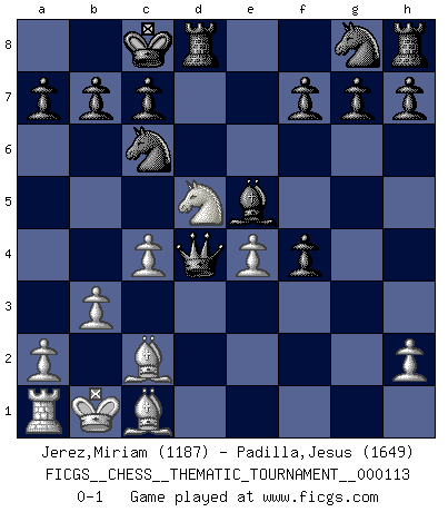 Last move : 0-1 2010 August 8 22:15:36 [Event "FICGS__CHESS__THEMATIC_TOURNAMENT__000113"] [Site "FICGS"] [Date "2010.05.10"] [Round "1"] [White "Jerez,Miriam"] [Black "Padilla,Jesus"] [Result "0-1"] [WhiteElo "1187"] [BlackElo "1649"] 1.e4 e5 2.f4 exf4 3.Nc3 Qh4+ 4.Ke2 d5 5.Nxd5 Bg4+ 6.Nf3 Bd6 7.d4 Bxf3+ 8.gxf3 Nc6 9.c4 O-O-O 10.Qe1 Qxe1+ 11.Kd3 Qd1+ 12.Kc3 Qxf3+ 13.Bd3 Qxh1 14.b3 Qe1+ 15.Kb2 Qf2+ 16.Bc2 Qxd4+ 17.Kb1 Be5 0-1 This chess game has been lost on time (started : 2010.05.10 14:42:10) KGA : Keres (Mason-Steinitz) gambit Queenside Castling by player Black (move 9) Player Black won this chess game. Follow this game move after move (download)In life, as in Chess, one's own Pawns block one's way. A man's very wealth, ease, leisure, children, books, which should help him to win, more often checkmate him. (Charles Buxton) Fallen sollten polizeilich verboten werden. (Savielly Grigorievitsch Tartakower) Los finales de Peón son del Ajedrez lo que el cesped es del Golf. (Cecil Purdy) Le jeu d'échecs fait naître et fortifie en nous plusieurs qualités précieuses dans le cours de l'existence, telles que la prévoyance, la circonspection, la prudence, et la persévérance. (Benjamin Franklin - 1783, la morale des échecs) Perhaps the current trend of many chess professionals taking up the more lucrative pastime of poker is not a wholly negative one. It may not be too late for humans to relearn how to take risks in order to innovate and thereby maintain the advanced lifestyles we enjoy. And if it takes a poker-playing supercomputer to remind us that we can't enjoy the rewards without taking the risks, so be it. (The Chess Master and the Computer, by Garry Kasparov - 2010)