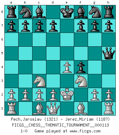 Last move : 1-0 2010 July 28 9:47:13 [Event "FICGS__CHESS__THEMATIC_TOURNAMENT__000113"] [Site "FICGS"] [Date "2010.05.10"] [Round "1"] [White "Pech,Jaroslav"] [Black "Jerez,Miriam"] [Result "1-0"] [WhiteElo "1321"] [BlackElo "1187"] 1.e4 e5 2.f4 exf4 3.Nc3 Qh4+ 4.Ke2 Qh5+ 5.Nf3 1-0 This chess game has been lost on time (started : 2010.05.10 14:42:10) KGA : Keres (Mason-Steinitz) gambit Player White won this chess game. Follow this game move after move (download)What is the difference between chess and football? Everybody understands football, but nobody plays it. Everybody plays chess, but nobody understands it. Everything is relative. (Vladimir Kramnik) Weshalb minderdergeübte Spieler mit g2-g4 beginnen? Die betreffenden sind unschlüssig, ob sie nun rechts (h4) oder links (f4) beginnen sollen, und in ihrer Ratlosigkeit entschliessen sie sich nach guter Bürgerart dazu, den goldenen Mittelweg zu wählen. (Aaron Nimzowitsch) Tu cuerpo tiene que estar en óptima condición. Tu Ajedrez se deteriora como lo hace tu cuerpo. No puedes separar la mente y el cuerpo. (Bobby Fischer) Aucun coup ne doit être joué sans but. (Pedro Damiano) When it is a question of money, everybody is of the same religion. (Voltaire)