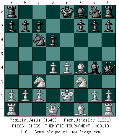 Last move : 1-0 2010 June 23 21:4:32 [Event "FICGS__CHESS__THEMATIC_TOURNAMENT__000113"] [Site "FICGS"] [Date "2010.05.10"] [Round "1"] [White "Padilla,Jesus"] [Black "Pech,Jaroslav"] [Result "1-0"] [WhiteElo "1649"] [BlackElo "1321"] 1.e4 e5 2.f4 exf4 3.Nc3 Qh4+ 4.Ke2 d6 5.Nf3 Bg4 6.d4 Nc6 7.Bxf4 1-0 This chess game has been lost on time (started : 2010.05.10 14:42:10) KGA : Keres (Mason-Steinitz) gambit Player White won this chess game. Follow this game move after move (download)The passed Pawn is a criminal, who should be kept under lock and key. Mild measures, such as police surveillance, are not sufficient. (Aaron Nimzovich) Der vorletzte Fehler gewinnt. (Savielly Grigorievitsch Tartakower) Haz el enroque temprano y seguido. (Rob Sillars) Vous n'êtes pas toujours obligé de jouer le meilleur coup. Un coup doit être actif, entreprenant, correct et beau ! (David Bronstein) Programming can only do so much before it becomes too much. (Don Groves)