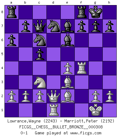 Last move : 0-1 2010 May 11 1:8:29 [Event "FICGS__CHESS__BULLET_BRONZE__000308"] [Site "FICGS"] [Date "2010.05.11"] [Round "1"] [White "Lowrance,Wayne"] [Black "Marriott,Peter"] [Result "0-1"] [WhiteElo "2243"] [BlackElo "2192"] 1.e4 c5 2.Nf3 d6 3.d4 cxd4 4.Nxd4 Nf6 5.Nc3 a6 6.Be3 e5 7.Nb3 Be6 8.Be2 Be7 9.O-O O-O 10.f4 exf4 11.Rxf4 Nc6 12.Qd2 Nd7 13.Rd1 Qc7 14.Nc5 dxc5 0-1 This chess game has been lost on time (started : 2010.05.11 0:57:13) Sicilian : Najdorf, Byrne (English) attack Kingside Castling by player White (move 9) Kingside Castling by player Black (move 9) Player Black won this chess game. Follow this game move after move (download)When the Chess game is over, the Pawn and the King go back to the same box. (Irish saying) Früher wurde jeder komplizierte Zug, jedes interessante Opfer mit großem Beifall und Enthusiasmus aufgenommen. Heute schaltet man einfach seinen Fritz an, und man kann sehen, was los ist, ob der Zug geht oder nicht. (Vladimir Kramnik) Uno por uno, yo los acribillé, mi superioridad muy pronto se volvio aparente. (Jose Capablanca) Les Echecs mettent en conflit, non pas deux intelligences, mais deux volontés. (Lasker) Treat your password like your toothbrush. Don't let anybody else use it, and get a new one every six months. (Clifford Stoll)