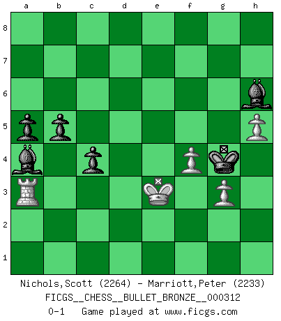 Last move : 0-1 2010 May 11 22:41:15 [Event "FICGS__CHESS__BULLET_BRONZE__000312"] [Site "FICGS"] [Date "2010.05.11"] [Round "1"] [White "Nichols,Scott"] [Black "Marriott,Peter"] [Result "0-1"] [WhiteElo "2264"] [BlackElo "2233"] 1.e4 e5 2.Nf3 Nc6 3.Bb5 Nf6 4.Nc3 Nd4 5.Ba4 Bc5 6.Nxe5 O-O 7.Nd3 Bb6 8.Nf4 c6 9.d3 d5 10.h3 dxe4 11.dxe4 Re8 12.O-O Nxe4 13.Nxe4 Rxe4 14.c3 Bc7 15.Be3 Nf5 16.Qxd8+ Bxd8 17.Bc2 Nxe3 18.Bxe4 Nxf1 19.Kxf1 Bc7 20.Rd1 a5 21.a4 f5 22.Bc2 Bxf4 23.Rd8+ Kf7 24.Bxf5 Bxf5 25.Rxa8 Bd3+ 26.Ke1 Ba6 27.Rd8 Ke7 28.Rd4 Bc1 29.Rg4 Bxb2 30.Rxg7+ Kf8 31.Rxh7 Bxc3+ 32.Kd1 Bg7 33.Rh4 Bf1 34.g3 Bg2 35.Kc2 Bd5 36.Rh5 b6 37.Rf5+ Ke7 38.Kd3 Bf7 39.Ke2 Bc4+ 40.Kd2 Bb3 41.Rf3 Bh6+ 42.Ke1 Bxa4 43.h4 b5 44.Ra3 c5 45.f4 c4 46.Kd2 Kf6 47.h5 Kf5 48.Ke3 Kg4 0-1 Ruy Lopez : Berlin defense Kingside Castling by player Black (move 6) Kingside Castling by player White (move 12) Player Black won this chess game. Follow this game move after move (download)Chess, like any creative activity, can exist only through the combined efforts of those who have creative talent, and those who have the ability to organize their creative work. (Mikhail Botvinnik) Ein Buch ist ein Spiegel; wenn ein Affe hineinsieht, so kann kein Apostel heraus gucken. (Georg Christoph Lichtenberg) Hay jugadores fuertes y personas amables y yo soy un jugador fuerte. (Bobby Fischer) La guerre est enfant de la passion, la passion est enfant du narcissisme et le narcissisme est l'enfant. (...) Une autre partie ? (Thibault de Vassal) Employ the attack like tactic of defense. (Chinese proverb)