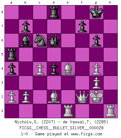 Last move : 1-0 2010 May 12 23:48:32 [Event "FICGS__CHESS__BULLET_SILVER__000028"] [Site "FICGS"] [Date "2010.05.12"] [Round "1"] [White "Nichols,Scott"] [Black "de Vassal,Thibault"] [Result "1-0"] [WhiteElo "2207"] [BlackElo "2285"] 1.e4 e6 2.d4 d5 3.Nd2 c5 4.Ngf3 Nc6 5.exd5 exd5 6.Bb5 Bd6 7.dxc5 Bxc5 8.O-O Nge7 9.Nb3 Bd6 10.h3 O-O 11.c3 Nf5 12.Re1 Bc7 13.Bd3 Qd6 14.Qc2 g6 15.g3 Bb6 16.Bf4 Qf6 17.Kg2 Ng7 18.Qd2 Ne6 19.Bh6 Rd8 20.Nh2 Qh8 21.f4 d4 22.c4 a5 23.f5 Ng7 24.fxg6 hxg6 25.Ng4 Bxg4 26.hxg4 a4 27.Rh1 Ne6 28.Qf2 Qe5 29.Rae1 Qd6 30.Nd2 Nc5 31.Ne4 Nxe4 32.Bxe4 Ra5 33.Bd2 1-0 French : Tarrasch, Open variation Kingside Castling by player White (move 8) Kingside Castling by player Black (move 10) Player White won this chess game. Follow this game move after move (download)Kasparov : J'adoube , Ivanchuk : S'il vous plaît ! (Garry Kasparov & Vassily Ivanchuk, Linares 1997) Alle offensichtlichen Züge sehen nach dem Spiel in der Analyse verdächtig aus. (Viktor Kortschnoi) Estaba muy claro de que el punto vulnerable del Gran Maestro Americano (Bobby Fischer) radicaba en las posiciones de doble filo, colgantes, irracionales, donde el siempre falló en encontrar un triunfo aún en una posición de clara victoria. (Efim Geller) Ce qui est bien, c'est d'avoir tout un tas de pièces en prise : l'adversaire ne peut en prendre qu'une à la fois. Cité par Thierry Audin. In God we trust, all others we virus scan. (Anonymous)
