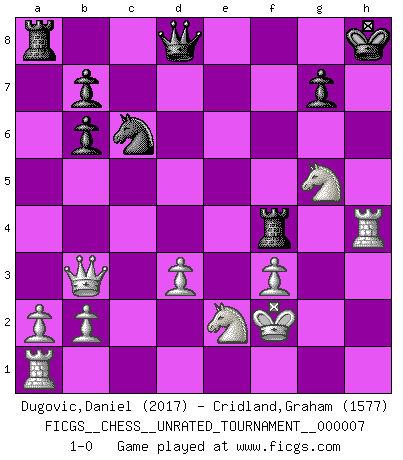 Last move : 1-0 2010 July 31 23:18:35 [Event "FICGS__CHESS__UNRATED_TOURNAMENT__000007"] [Site "FICGS"] [Date "2010.05.14"] [Round "1"] [White "Dugovic,Daniel"] [Black "Cridland,Graham"] [Result "1-0"] [WhiteElo "2017"] [BlackElo "1577"] 1.c4 c6 2.e4 d5 3.cxd5 cxd5 4.exd5 Nf6 5.Qa4+ Bd7 6.Qb3 Qc7 7.Nc3 e6 8.Bc4 Bc5 9.Nge2 O-O 10.dxe6 fxe6 11.Bxe6+ Kh8 12.O-O Nc6 13.Bxd7 Qxd7 14.d3 Ng4 15.Ne4 Bb6 16.h3 Nge5 17.Be3 Nf3+ 18.gxf3 Qxh3 19.Bxb6 axb6 20.f4 Qg4+ 21.N4g3 h5 22.f3 Qg6 23.Kf2 h4 24.Rh1 Qf6 25.Ne4 Qd8 26.Ng5 Rxf4 27.Rxh4+ 1-0 English : Caro-Kann defensive system Kingside Castling by player Black (move 9) Kingside Castling by player White (move 12) Player White won this chess game. Follow this game move after move (download)Place the contents of the Chess box in a hat, shake them up vigorously, pour them on the board from a height of two feet, and you get the style of Steinitz. (H. E. Bird) Wenn du nicht weißt was du tun sollst, warte bis dein Gegner eine Idee hat. Sie wird sicher schlecht sein. (Siegbert Tarrasch) Un buen sacrificio es aquel que aunque no sea necesariamente sólido, deja a tu oponente aturdido y confuso. (Rudolph Spielmann) On entre au jeu d'Echecs comme on entre en Religion. Pour le joueur d'Echecs, la partie d'Echecs c'est l'office, la messe, le défilé du 1er Mai, le dépôt de gerbe au Monument aux Morts. C'est un drame sacré. (Michel Roos) Memory is a crazy woman that hoards colored rags and throws away food. (Austin O'Malley)