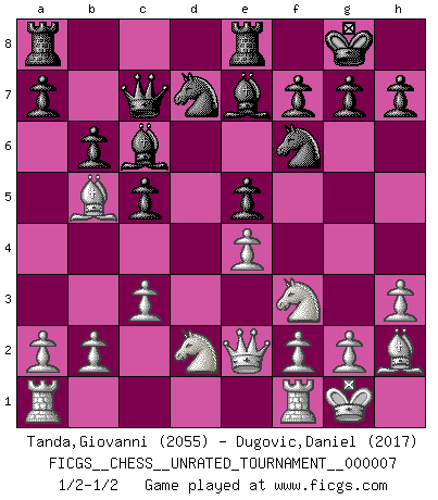 Last move : 1/2-1/2 2010 September 6 2:38:42 [Event "FICGS__CHESS__UNRATED_TOURNAMENT__000007"] [Site "FICGS"] [Date "2010.05.14"] [Round "1"] [White "Tanda,Giovanni"] [Black "Dugovic,Daniel"] [Result "1/2-1/2"] [WhiteElo "2055"] [BlackElo "2017"] 1.d4 Nf6 2.Nf3 c5 3.c3 e6 4.Bf4 b6 5.e3 Bb7 6.h3 Be7 7.Nbd2 O-O 8.Bd3 d6 9.O-O Nbd7 10.Qe2 Qc7 11.e4 e5 12.dxe5 dxe5 13.Bh2 Rfe8 14.Ba6 Bc6 15.Bb5 Bb7 16.Ba6 Bc6 17.Bb5 1/2-1/2 Queen's pawn game Kingside Castling by player Black (move 7) Kingside Castling by player White (move 9) This chess game ended in a draw. Follow this game move after move (download)I know people who have all the will in the world, but still can't play good Chess. (Bobby Fischer) Ich bin der einzige Schachspieler, der sich während der Vorbereitungen zum Turnier verletzt hat. (Woody Allen) El Ajedrez es el juego mas altamente simbólico, pero las agresiones estan por lo tanto aún mas francamente representadas en la partida. Tal vez comenzo como un juego de guerra; Algo como la representación de una batalla en miniatura entre las fuerzas de dos reinos. (Karl Meninger) Votre prénom est 'Tactique', votre deuxième prénom est 'Tactique' et votre nom est 'Tactique'. (Ken Smith) The message for business people contemplating their place in the cyberspace is simple and direct: get linked or get lost. (Vic Sussman and Kenan Pollack)